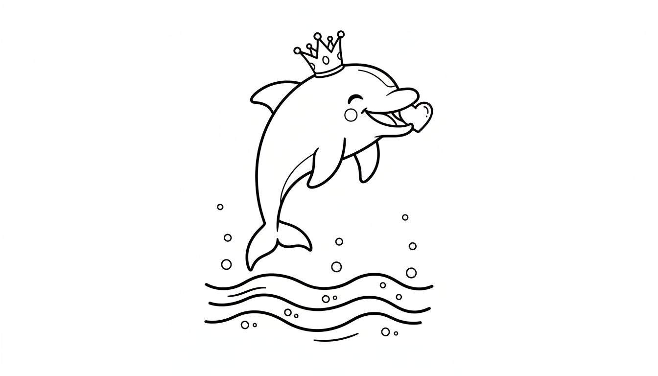 Ontdek deze leuke zwarte lijntekening van een springende dolfijn met een koninklijke kroon en een lief hartje in zijn bek. Perfect voor kinderen om in te kleuren, met golven en bubbels voor extra plezier.