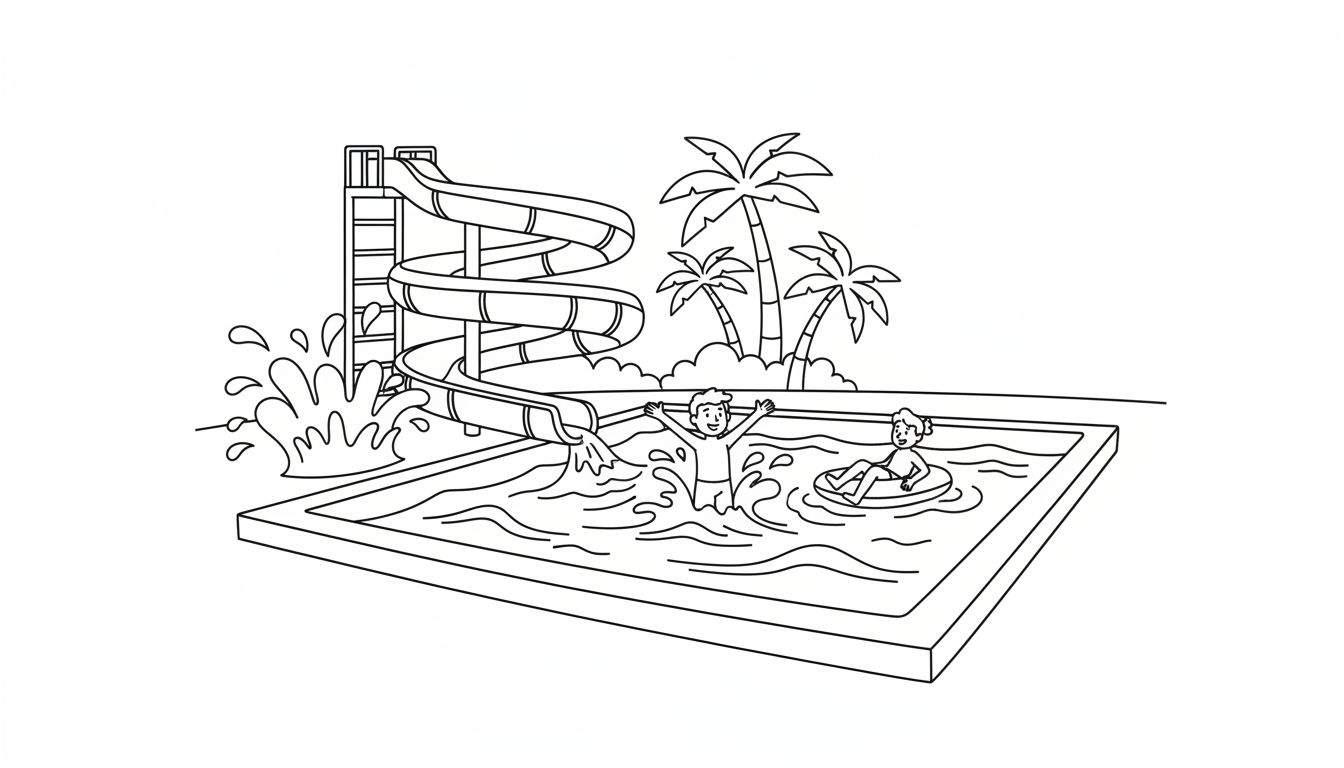 Kleurplaat van een levendige scène bij een waterpark met een grote spiraalvormige waterglijbaan, een zwembad met golvend water, twee spelende kinderen en tropische palmbomen op de achtergrond. Een tekening vol zomerse vrolijkheid en waterpret.