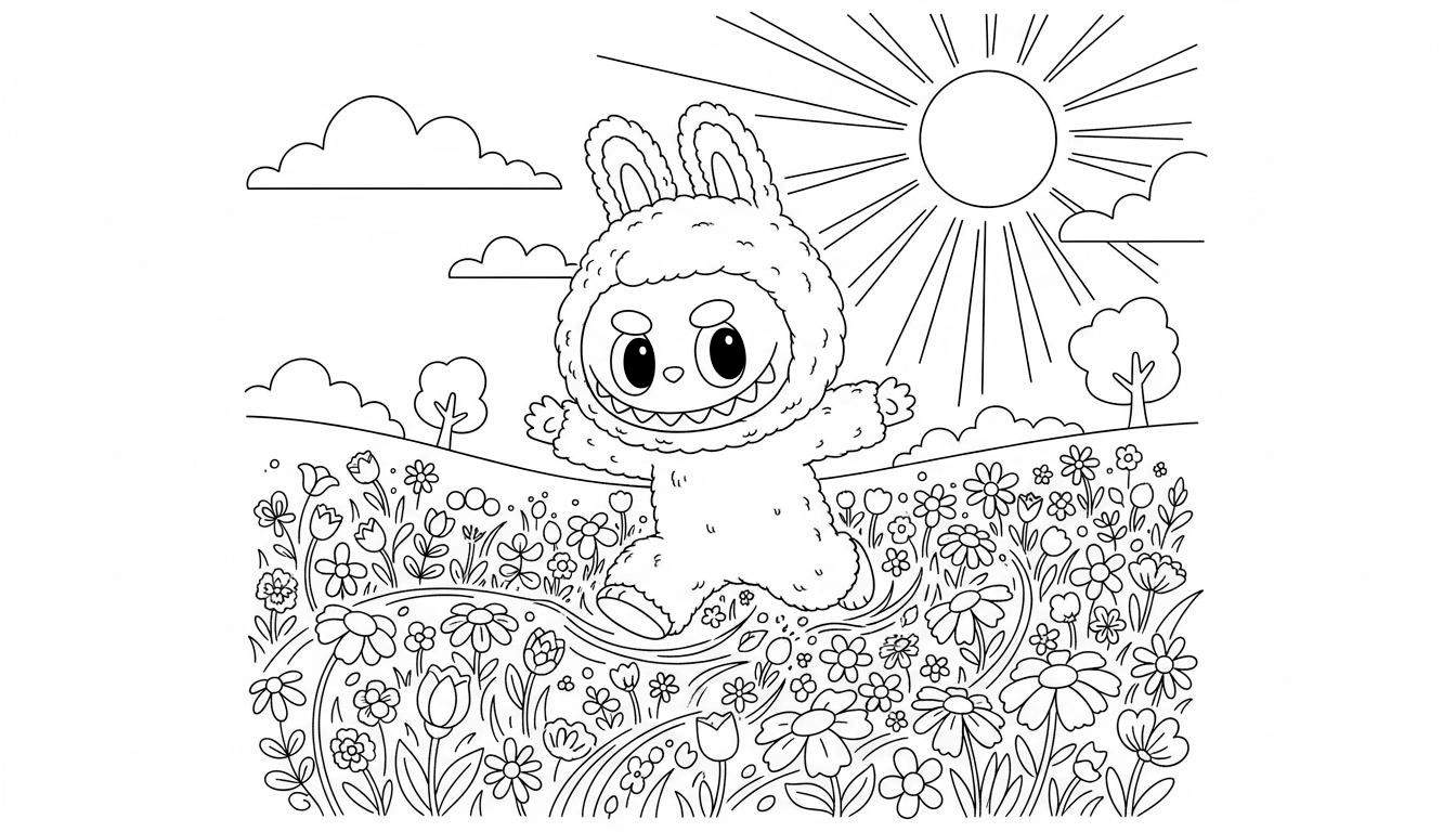 Een betoverende zwart-wit lijntekening van Labubu, het pluizige wezentje met grote konijnenoren en een glimlach vol puntige tandjes. Labubu rent, springt en spreidt zijn armen van vreugde in een uitgestrekt bloemenveld vol diverse flora. Op de achtergrond is een glooiend landschap met eenvoudige bomen te zien, terwijl de stralende zon en enkele wolken de lucht vullen. Deze vrolijke kleurplaat ademt een lente- of zomerse sfeer uit en nodigt uit tot creatief inkleuren.