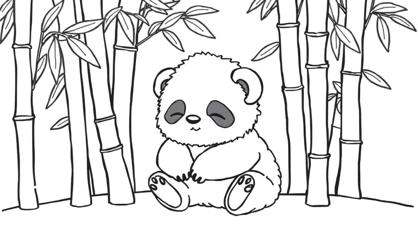 Gratis te downloaden zwart-witte lijntekening van een vredige, pluizige panda die zit te midden van hoge bamboestengels. Perfect voor uren kleurplezier voor jong en oud!