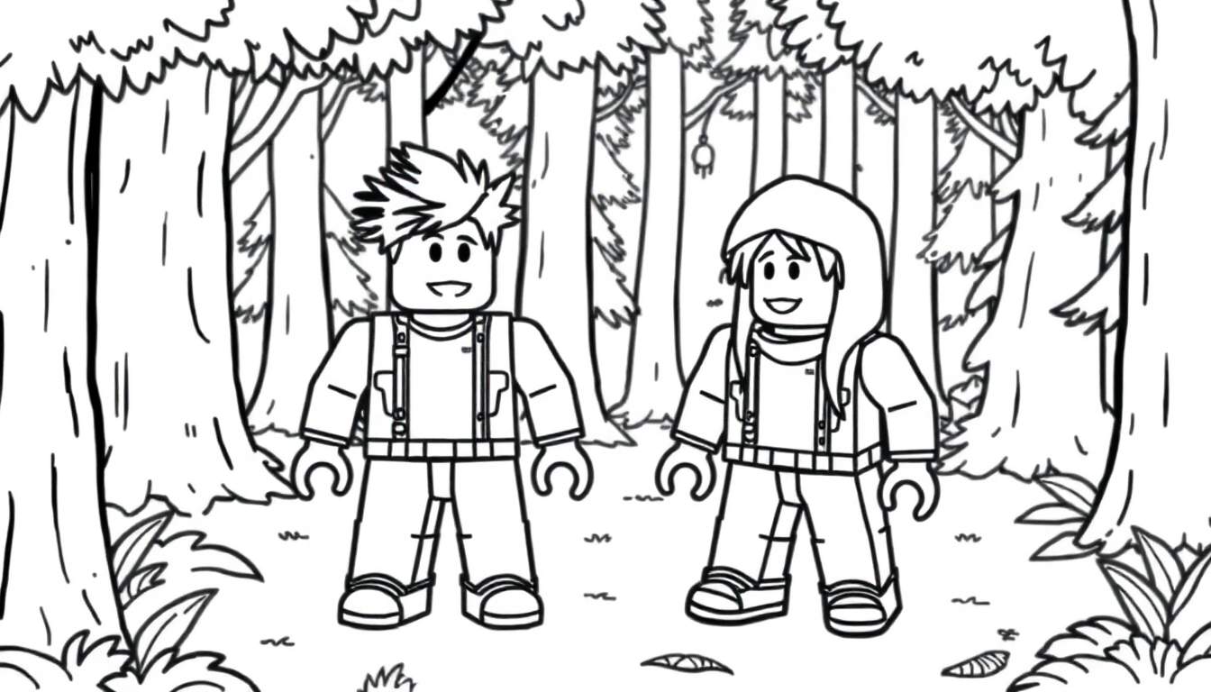 Een leuke kleurplaat voor kinderen met een jongen en een meisje in Lego- of Roblox-stijl, spelend in een levendig bos. Perfect om creativiteit te stimuleren!