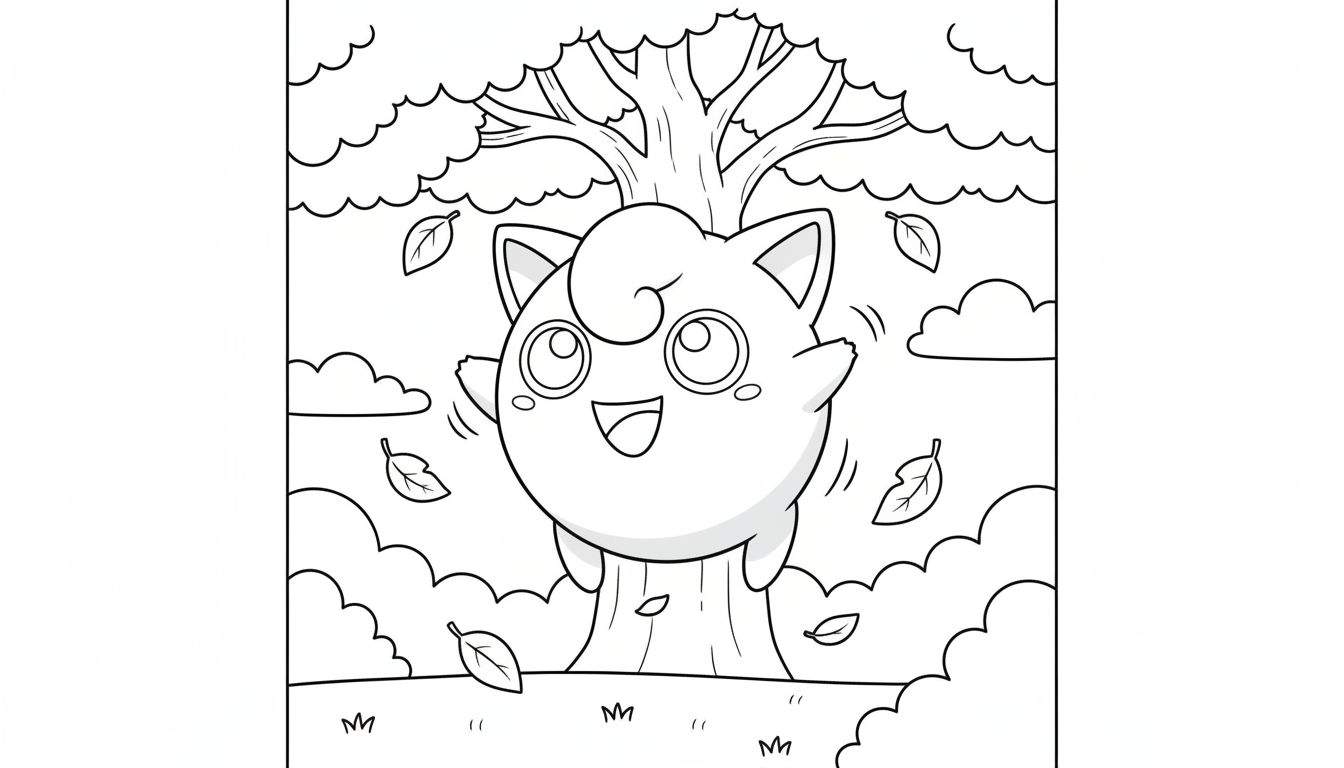 Laat je creativiteit de vrije loop met deze charmante Jigglypuff kleurplaat, speciaal ontworpen om de warmte en vrolijkheid van de herfst te vangen. Dit gedetailleerde lijntekening toont de iconische Pokémon Jigglypuff in een uitbundige bui, breed lachend met de armpjes omhoog, staand op een stevige boomstronk. De achtergrond is verrijkt met een majestueuze boom waarvan de takken sierlijk boven Jigglypuff uitsteken, terwijl diverse herfstbladeren speels rondzweven en op de grond liggen.