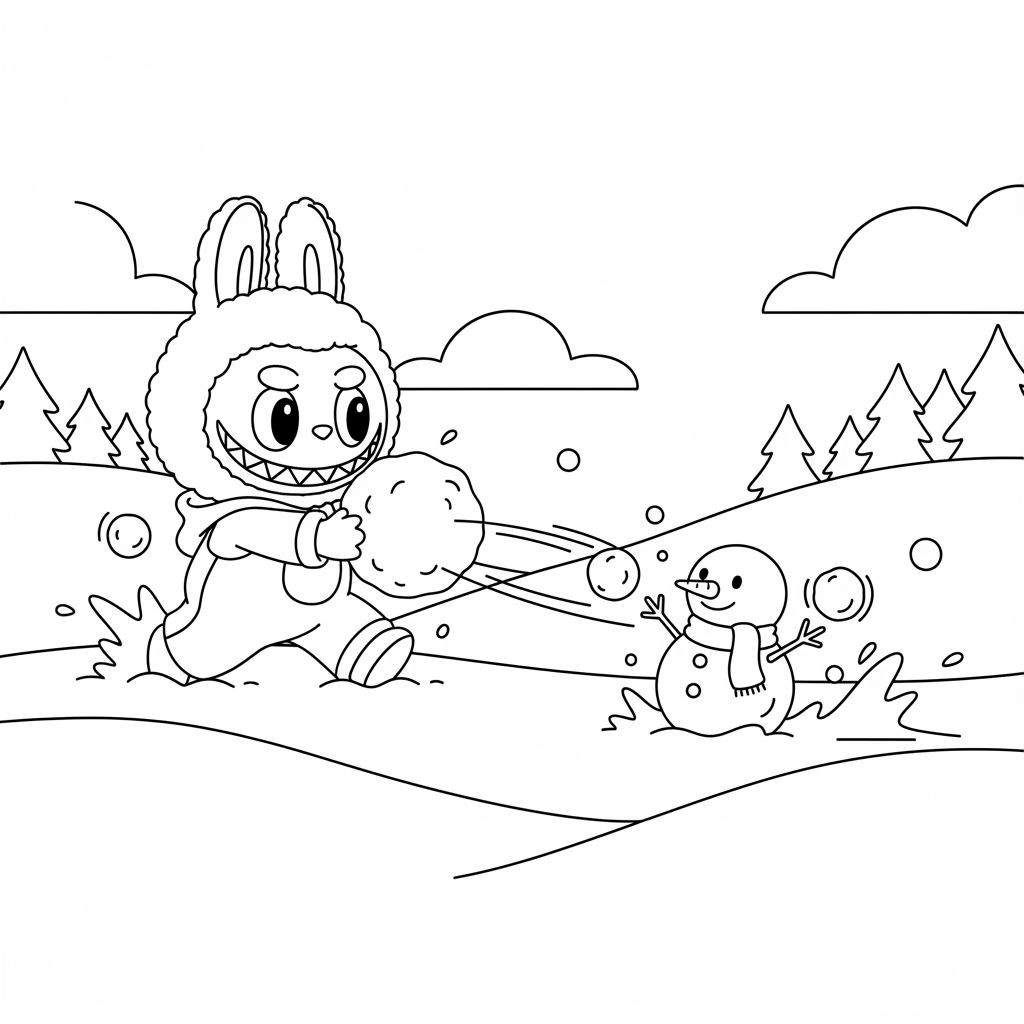 Labubu Sneeuwballengevecht Kleurplaat: Ondeugend Konijn vs. Sneeuwpop in de Sneeuw