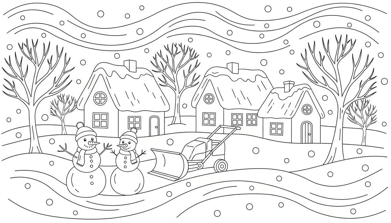 Een vrolijke winterse kleurplaat met een gezellig landschap. De tekening toont vallende sneeuw, drie huizen met besneeuwde daken, kale bomen, twee charmante sneeuwpoppen met mutsen en sjaals, en een sneeuwruimer. Het glooiende terrein is volledig bedekt met sneeuw, wat zorgt voor een warme en uitnodigende sfeer.