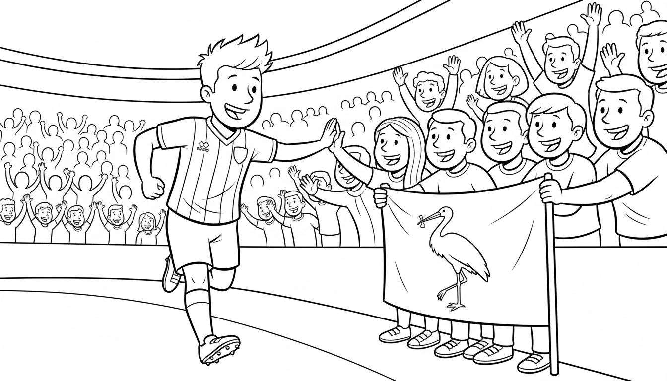 Duik in de feestelijke sfeer van het Cars Jeans Stadion met deze vrolijke ADO Den Haag kleurplaat! Een lachende voetballer in zijn gestreepte shirt geeft een high-five aan een enthousiaste fan, omringd door jubelende supporters die een vlag met een ooievaar vasthouden. Op de achtergrond zwaaien de tribunes mee met silhouetten van juichende toeschouwers. Perfect voor jonge en oude ADO-fans om in te kleuren en de clubliefde te vieren!