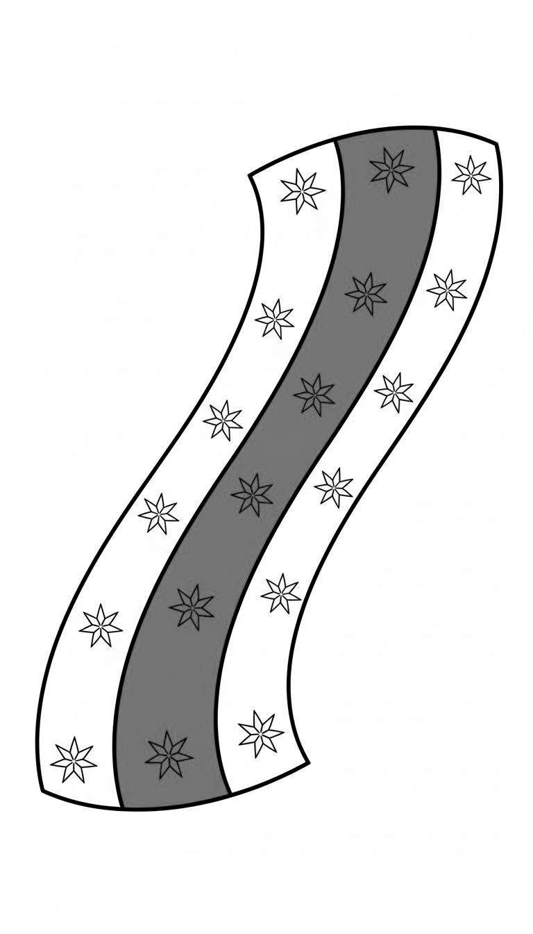 Duik in de wereld van Ajax met deze unieke kleurplaat! Je ziet een dynamische, langwerpige en golvende vorm, die doet denken aan een feestelijke wimpel of een sierlijk lint. Deze vorm is verticaal verdeeld in drie opvallende banen: een grijze middenbaan geflankeerd door twee helderwitte buitenbanen. Alle contouren en scheidingslijnen zijn dik en zwart, wat zorgt voor duidelijke kleurvlakken. Op elke baan prijken zes zevenpuntige sterren, diagonaal geplaatst om de lengte te vullen. De sterren op de witte banen zijn speels omlijnd en wit van binnen, terwijl de sterren op de grijze baan krachtig effen zwart zijn ingevuld. In totaal wachten achttien sterren erop om door jou tot leven gebracht te worden, perfect voor jonge en oude Ajax-fans!