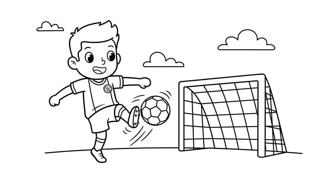 Deze zwart-wit lijntekening vangt een dynamisch moment: een jongen die met een grote glimlach de bal precies goed raakt met zijn rechtervoet. De bewegingsstreepjes rondom de bal laten zien hoe krachtig de trap is, en het doel met het net rechts van hem wacht al op de winnende score. Met gestileerde wolken in de lucht en een duidelijke grondlijn, is dit plaatje perfect om in te kleuren en zo je eigen Ajax-held te creëren.