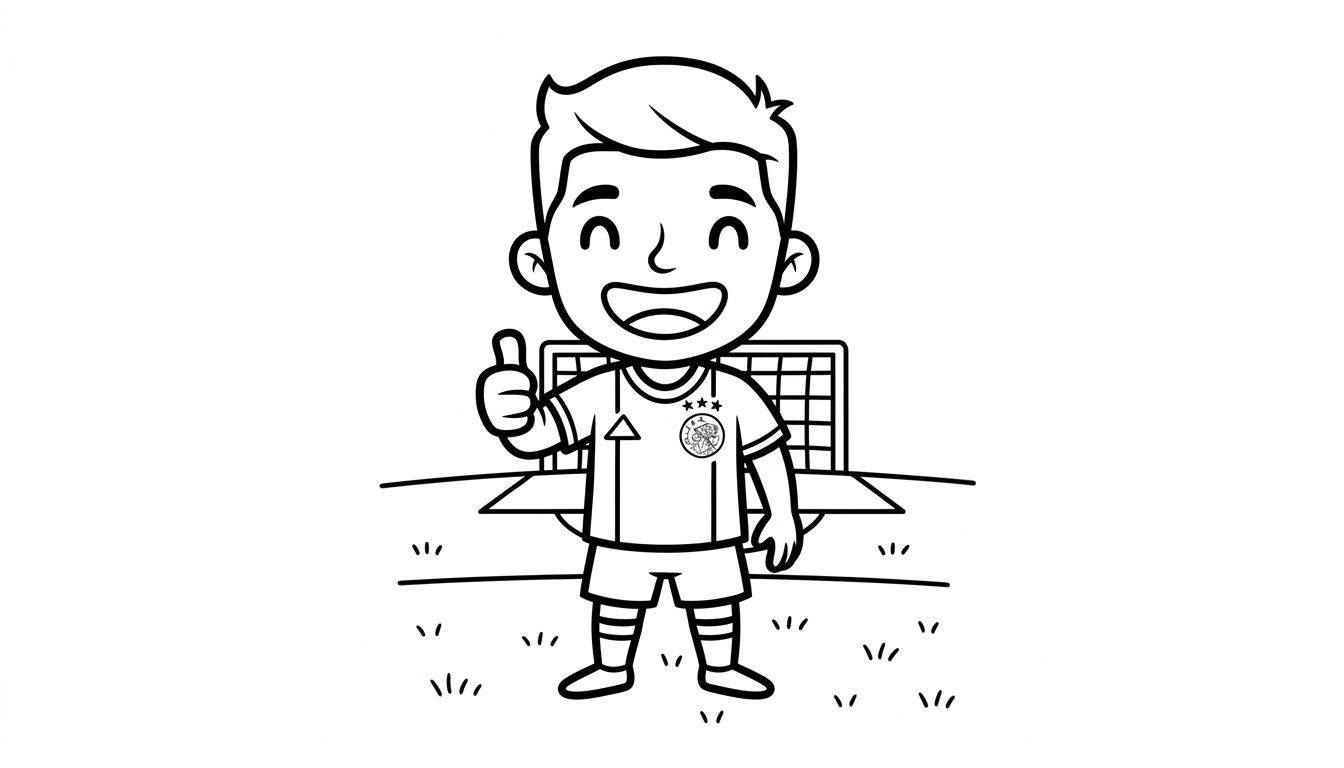Duik in de wereld van voetbal met deze fantastische zwart-wit lijntekening, perfect voor jonge fans van Ajax. De kleurplaat toont een opgewekte voetbaljongen, stralend van plezier, die breed lacht met zijn ogen dichtgeknepen van geluk. Met zijn linkerhand steekt hij trots een duim omhoog, een teken van succes of aanmoediging. Achter hem staat een voetbaldoel, wat de droom van elke jonge voetballer belichaamt, terwijl hij op een grasveld staat, klaar voor actie.