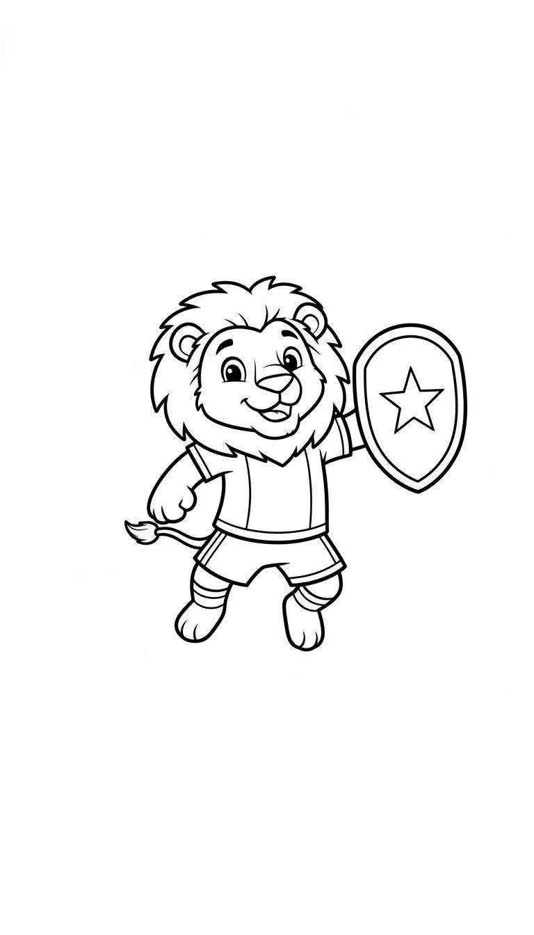 Een vrolijke, zwart-wit kleurplaat van een getekende leeuw, speciaal voor jonge Ajax-fans. De leeuw is gekleed in een sporttenue, bestaande uit een shirt en een korte broek, en houdt trots een schild in zijn linkerhand. Op dit schild is duidelijk een opvallende ster afgebeeld. Deze Ajax-kleurplaat is perfect voor kinderen om in te kleuren en hun favoriete club te vieren.