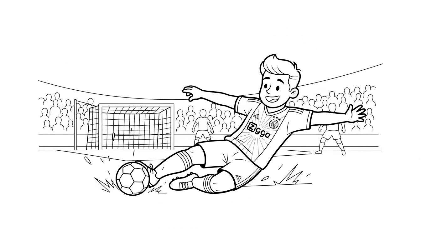 Stap in de wereld van de Eredivisie met deze levendige kleurplaat, perfect voor elke jonge Ajax-fan! Centraal staat een vrolijke, blondharige voetballer die een indrukwekkende sliding maakt om de bal te veroveren. Zijn tenue, compleet met de herkenbare sponsornaam ‘Ziggo’ en het iconische Ajax-logo met drie sterren erboven, nodigt uit om ingekleurd te worden in de clubkleuren. Dit is niet zomaar een plaatje; het is een uitnodiging om deel te nemen aan de actie op het veld.