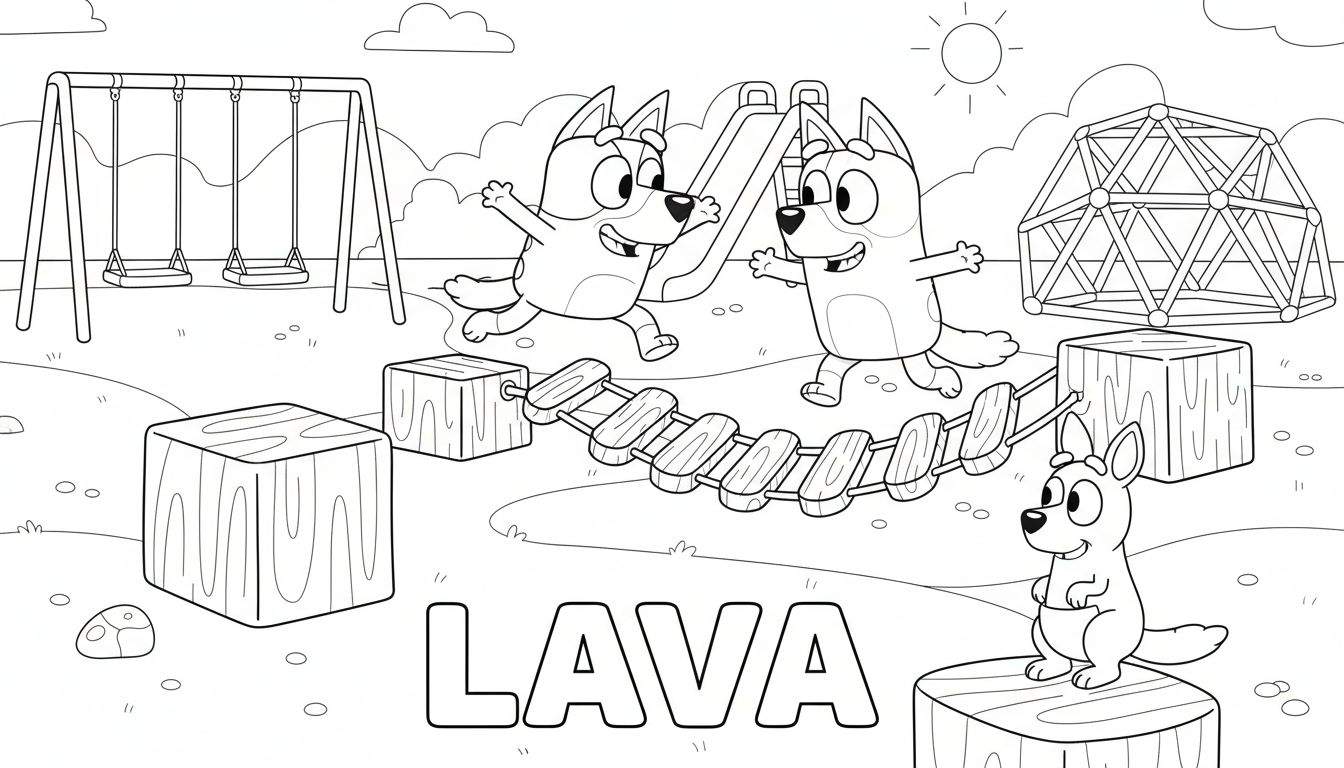 Kleurplaat van Bluey en Bingo die het populaire spel ‘De vloer is lava’ spelen in een levendige speeltuin. Met schommels, een glijbaan, klimrek en houten blokken om de lavagrond te ontwijken. Perfect voor jonge fans van Bluey!
