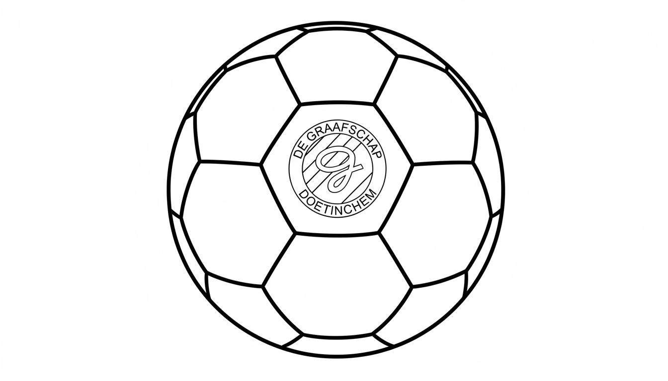 Zwart-wit lijntekening kleurplaat van een voetbal met daarop het officiële logo van voetbalclub De Graafschap uit Doetinchem. Het ronde logo toont de teksten ‘DE GRAAFSCHAP’ en ‘DOETINCHEM’ met in het midden een gestileerde ‘G’.