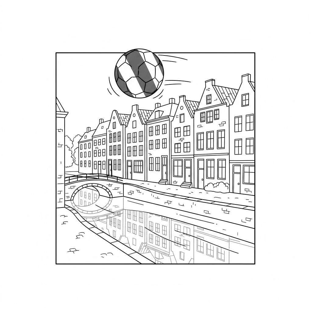 Een gedetailleerde zwart-wit lijntekening kleurplaat van een sfeervol stadsgezicht. Bovenin zweeft een iconische zwart-witte voetbal met bewegingsstrepen. Eronder ontvouwt zich een rij typisch Nederlandse grachtenpanden met diverse ramen, deuren en puntdaken. Op de voorgrond stroomt een gracht met heldere weerspiegelingen van de huizen en een stenen boogbrug die de gracht overspant. Deze kleurplaat, in de stijl van FC Groningen, nodigt uit om creatief aan de slag te gaan met kleuren en de charme van een Nederlandse stad te vangen.