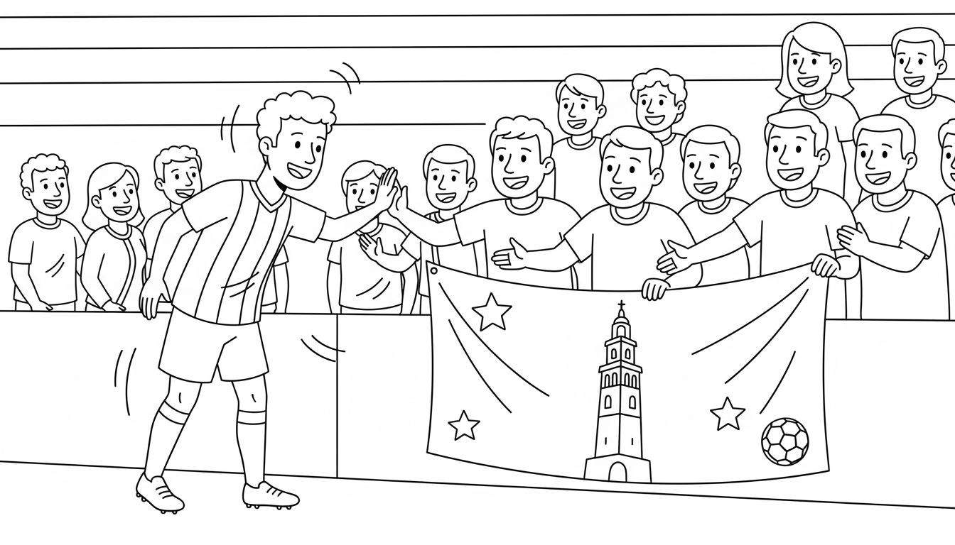 Deze zwart-wit lijntekening, perfect als kleurplaat, toont een levendige scène vol vreugde en sportiviteit rondom FC Groningen. Centraal staat een breed lachende FC Groningen voetballer in zijn gestreepte tenue, die achter een afscheiding een hartelijke ‘high five’ of handdruk uitwisselt met enthousiaste supporters. De groep supporters, bestaande uit lachende mannen en vrouwen, houdt gezamenlijk een groot spandoek omhoog. Op dit spandoek prijkt aan de linkerzijde trots een iconische, hoge toren die sterk doet denken aan de Martinitoren van Groningen, compleet met kruis. Aan de rechterzijde sieren een voetbal en twee sterren, omringd door dynamische lijnen die beweging symboliseren. Op de achtergrond zijn de horizontale lijnen van stadiontribunes zichtbaar. Het geheel ademt een warme sfeer van verbinding tussen de club, de speler en zijn loyale fans.