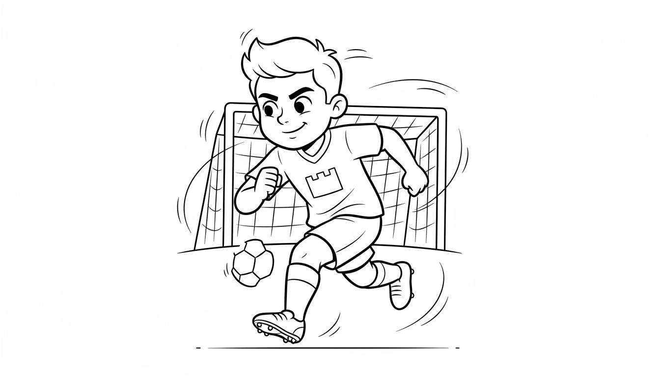 Deze dynamische kleurplaat van een jonge voetballer vangt perfect de energie en droom van elke beginnende atleet. Terwijl de bal aan zijn linkervoet kleeft en hij met een vrolijke, vastberaden blik richting het doel dribbelt, is het alsof je de actie bijna hoort! Het is dé uitgelezen kans voor jonge FC Twente fans om hun favoriete clubkleuren tot in detail in te kleuren en zo hun eigen sterspeler te creëren.