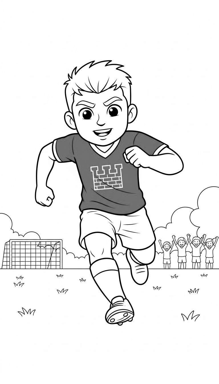 Download deze vrolijke FC Twente kleurplaat! Een jonge, energieke voetballer met stekelig haar rent juichend naar voren, gekleed in zijn tenue met een FC Twente-achtig logo (kasteelmuur/W). Op de achtergrond staat een voetbaldoel en juichen enthousiaste fans. Perfect voor jonge FC Twente supporters om in te kleuren en de sportieve sfeer te ervaren!