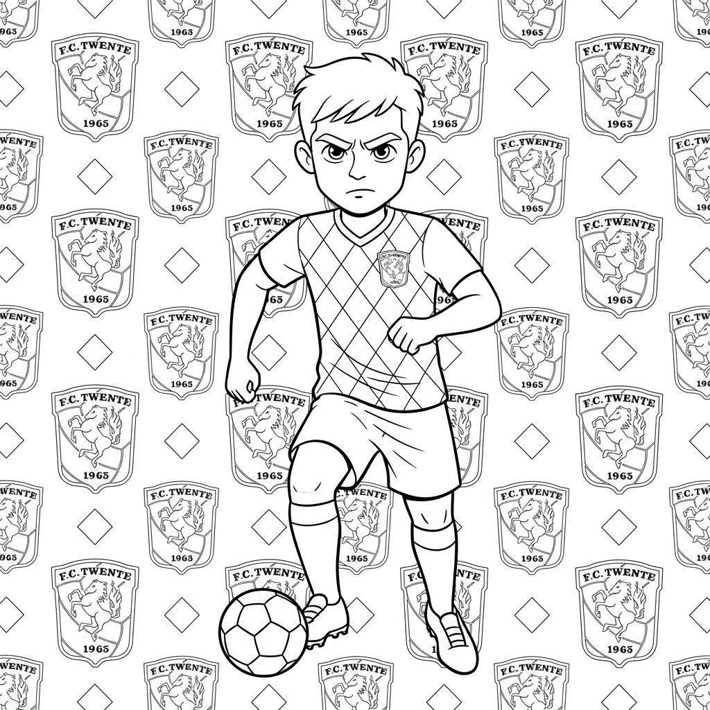 Deze unieke zwart-wit kleurplaat vangt de essentie van de FC Twente spirit in één krachtig beeld. Centraal staat een jonge voetballer, wiens geconcentreerde en vastberaden uitdrukking de ambitie en vechtlust symboliseert die zo kenmerkend zijn voor de club en haar aanhang. Gekleed in een tenue met een opvallend ruitpatroon en het clublogo op de borst, staat hij klaar om de bal te beheersen, een visuele voorbode van toekomstige successen op het veld.