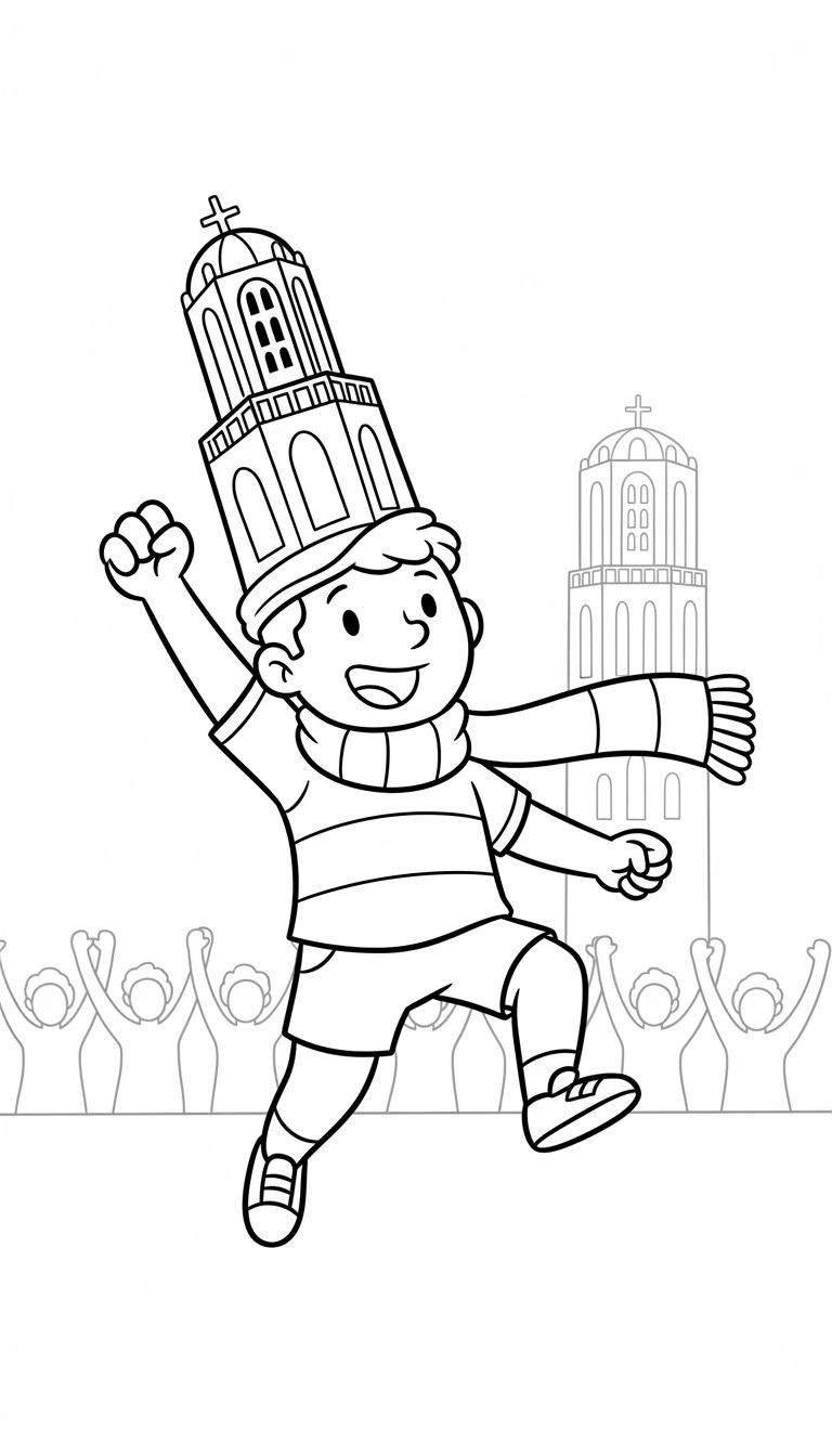 Deze dynamische zwart-wit kleurplaat vangt de energie van een vrolijke jongen die juicht of rent, compleet met een unieke hoed in de vorm van de iconische Domtoren van Utrecht. Hij draagt een gestreepte sjaal en T-shirt, korte broek en sportschoenen, wat bijdraagt aan de sportieve sfeer. Op de achtergrond staat een grotere Domtoren en aan de onderkant zijn de silhouetten van juichende mensen te zien. Een perfecte kleurplaat die de feestelijke en sportieve geest van FC Utrecht en de stad Utrecht viert.