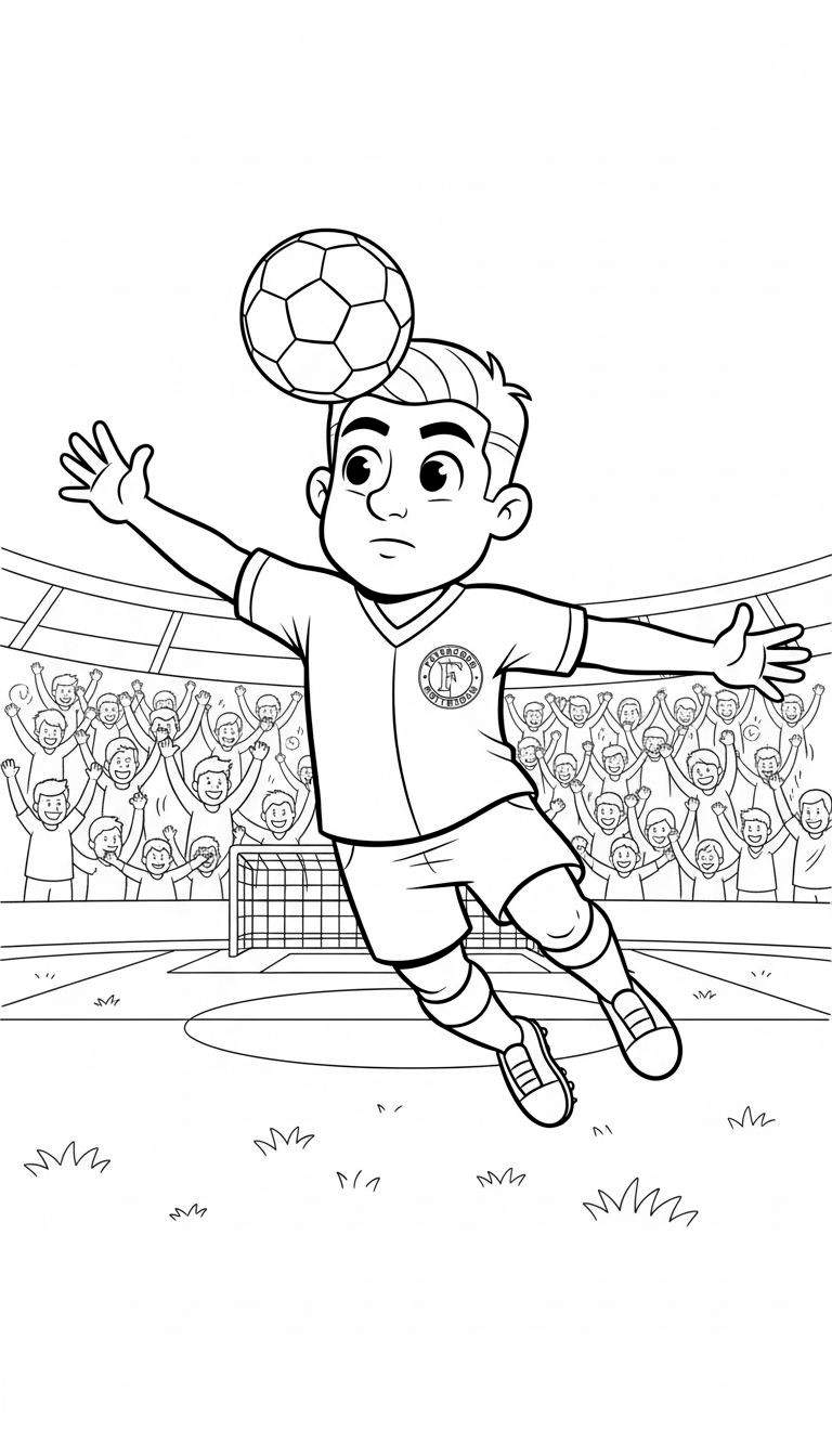 Duik in de wereld van voetbal met deze fantastische kleurplaat! Centraal staat een jonge, energieke voetballer die met pure concentratie een spectaculaire kopbal uitvoert. Omringd door de sfeer van een bruisend stadion met juichende fans en een imposant doel op de achtergrond, ademt deze tekening de opwinding van een belangrijke wedstrijd. Het duidelijke ‘F’ embleem op zijn shirt laat zien dat hij de kleuren van Feyenoord draagt, klaar om voor glorie te gaan.