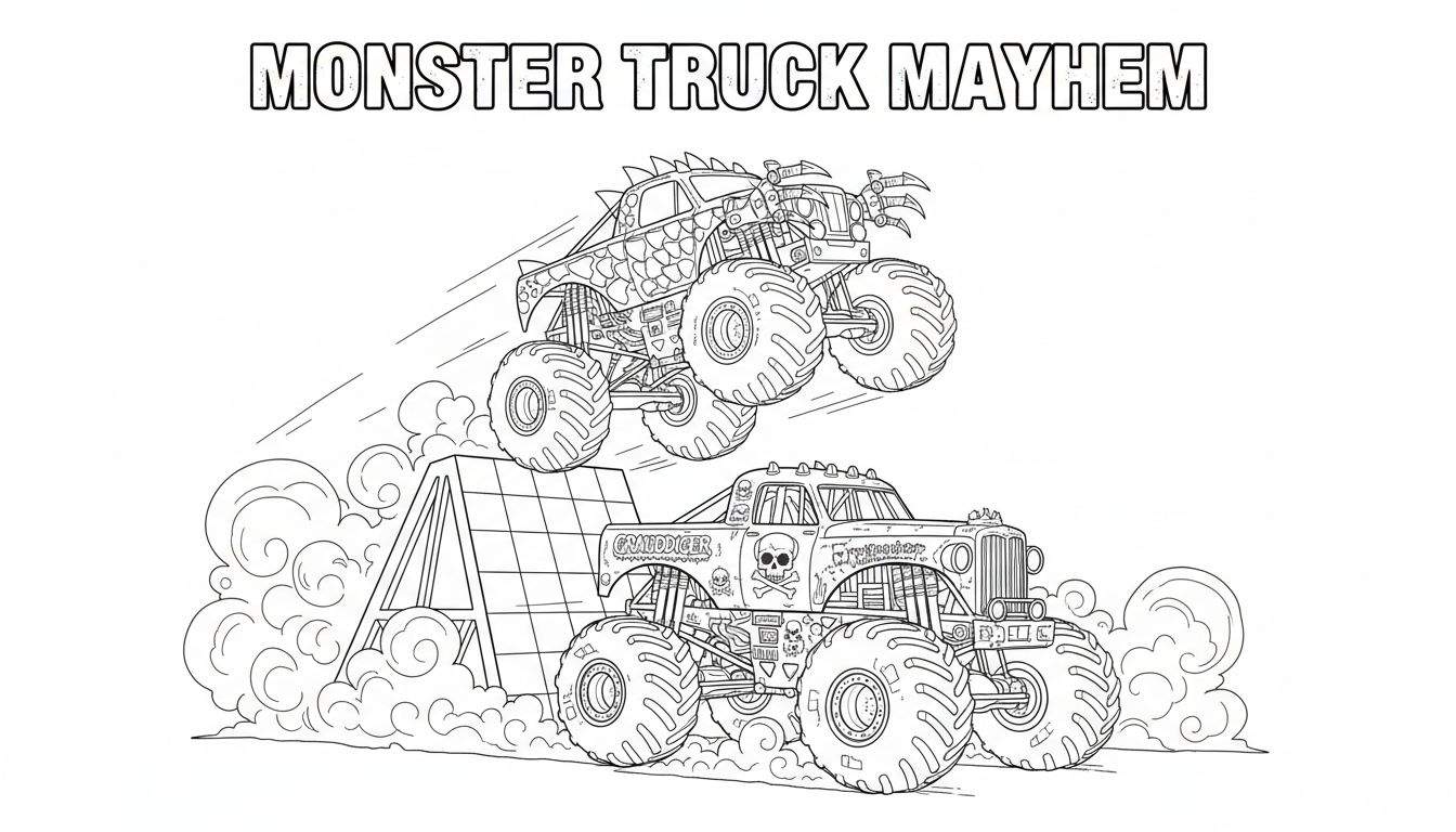 Kleurplaat van twee monstertrucks in actie, getiteld ‘MONSTER TRUCK MAYHEM’. Een draak-achtige truck springt spectaculair over een schans, terwijl een klassieke truck met skull & crossbones decoratie eronder staat. Ideaal voor kinderen die van snelle actie en stoere voertuigen houden.
