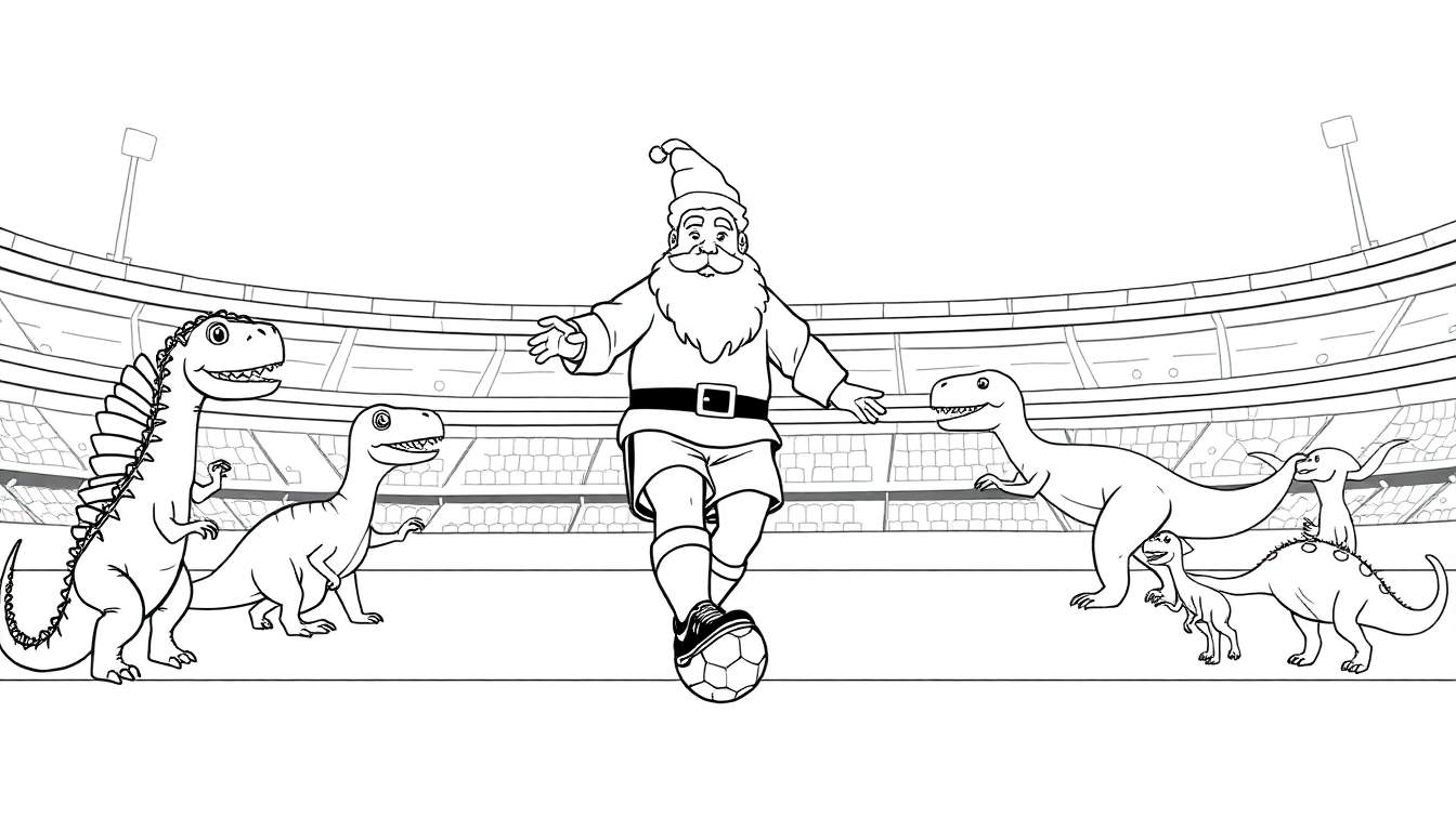 Ontdek een unieke zwart-wit kleurplaat waarop de Kerstman en een groep vrolijke dinosaurussen samen voetballen in een bruisend stadion. Perfect voor uren kleurplezier en fantasie!