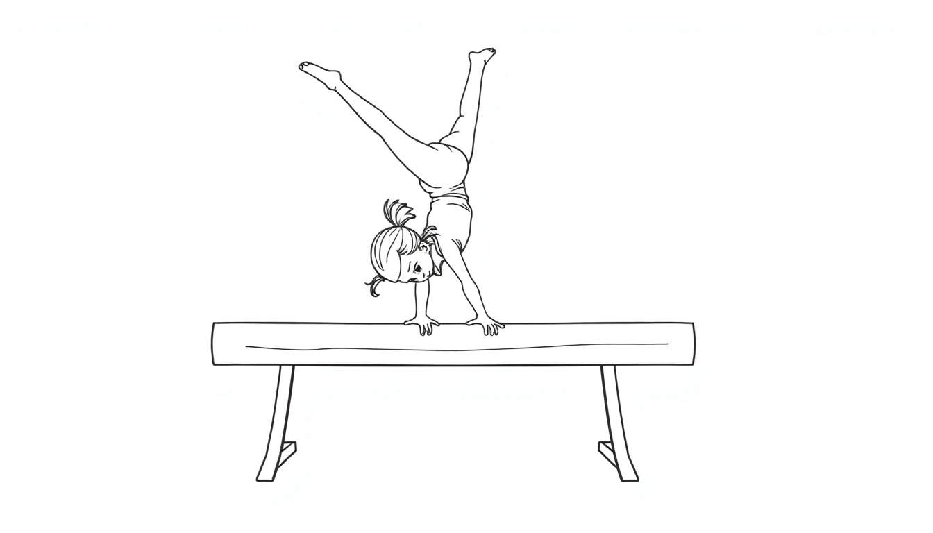 Een eenvoudige lijntekening van een jong meisje dat een handstand maakt op een evenwichtsbalk. Ze heeft haar benen gespreid in een V-vorm en haar hoofd naar beneden gericht. Perfect om in te kleuren!