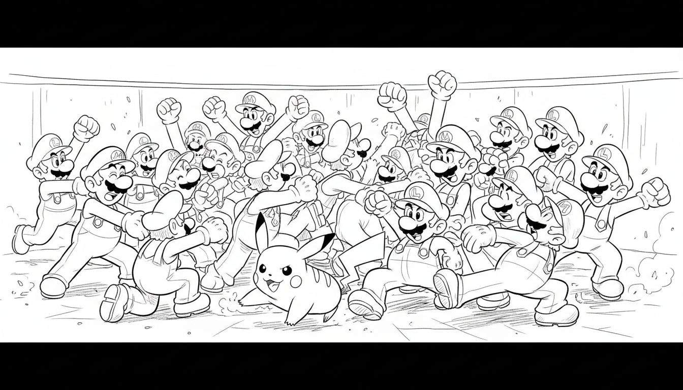 Een dynamische zwart-wit kleurplaat met een grote menigte enthousiaste Luigi’s en Mario’s die in beweging zijn, vergezeld door een blije Pikachu. Perfect voor uren kleurplezier!