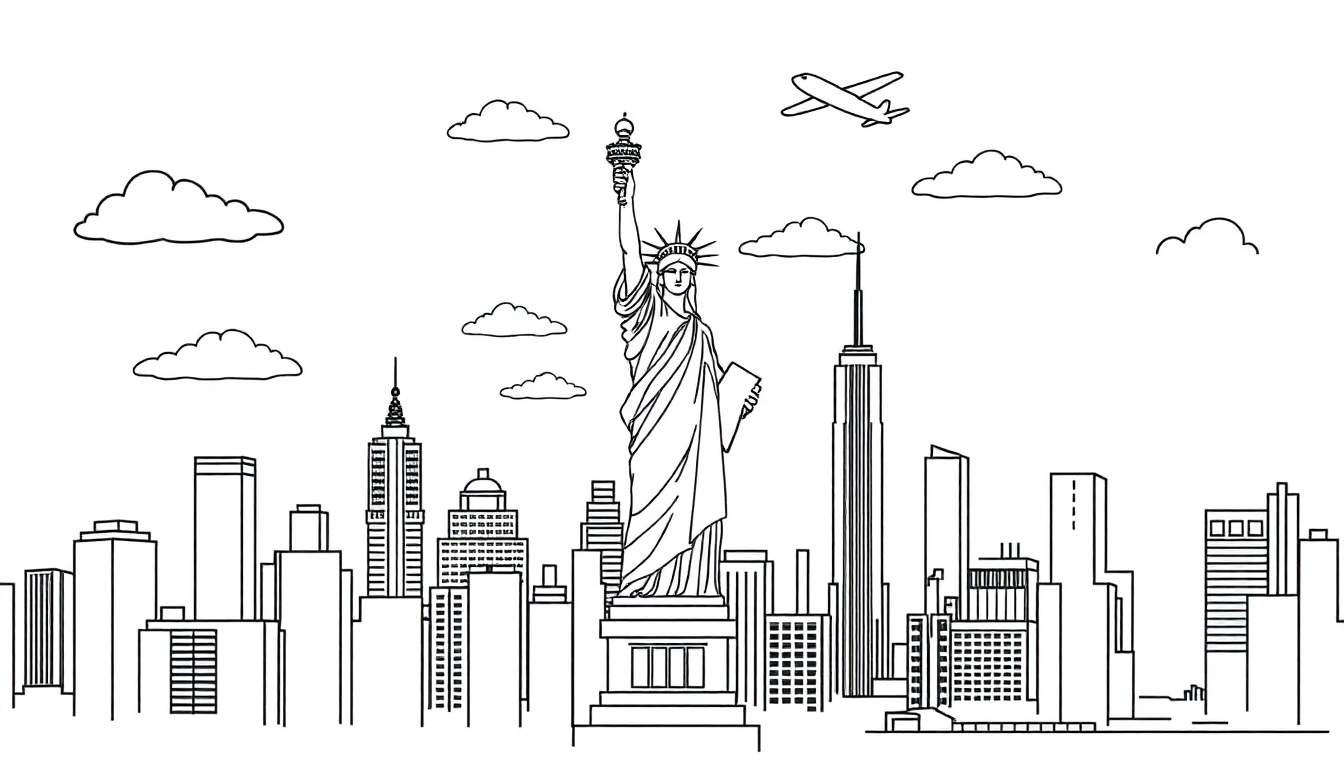 Een eenvoudige zwart-wit lijntekening van de iconische skyline van New York City, compleet met het Vrijheidsbeeld, imposante wolkenkrabbers, gestileerde wolken en een vliegend vliegtuig. Perfect als kleurplaat voor jong en oud.