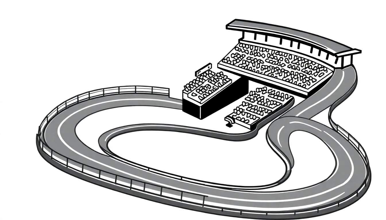 Duik in de spannende wereld van autosport met deze unieke kleurplaat! Dit plaatje neemt je mee naar een dynamisch racecircuit, gezien vanuit een vogelvluchtperspectief. De illustratie is een meesterwerk van eenvoud en helderheid, met strakke lijnen die het kronkelende circuit, de scherpe bochten en de uitdagende lussen perfect weergeven. Grijs gekleurd voor de baan, met duidelijke witte strepen om de rijrichting aan te geven, en robuuste zwarte hekken langs de zijkanten die de adrenaline-verhogende actie in bedwang houden. Drie tribunes, variërend in grootte, wachten erop om door jou tot leven te worden gebracht met kleur. De grootste, met zijn iconische zwarte dak, strekt zich uit langs een recht stuk en een uitdagende bocht, terwijl twee kleinere tribunes het tafereel completeren. Elk van deze tribunes is gevuld met kleine, ovale vormen die het enthousiaste publiek voorstellen, klaar om hun favoriete coureurs aan te moedigen.
