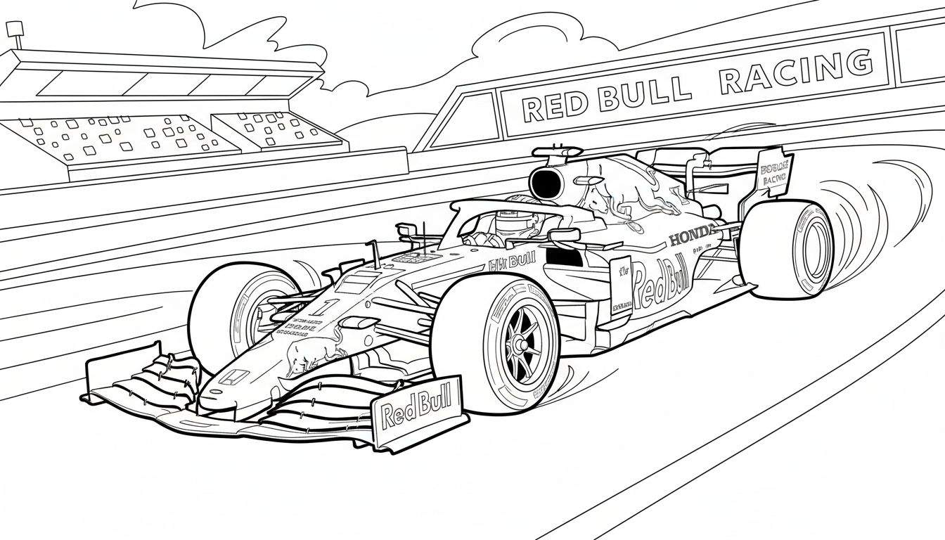 Gratis kleurplaat van een Red Bull Racing Formule 1-raceauto met coureur op een bochtig circuit. Ideaal voor jonge raceliefhebbers en fans van Max Verstappen. Download en print nu voor uren kleurplezier!