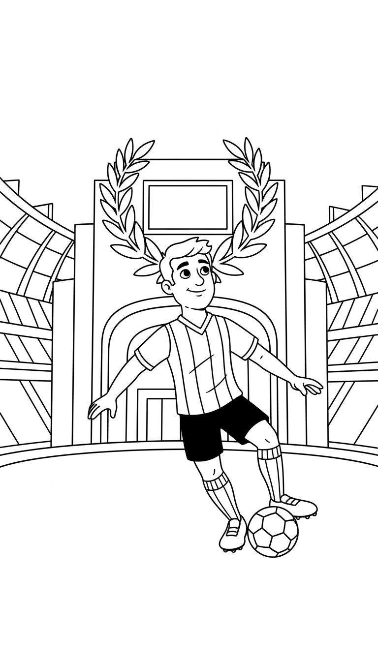 Ontdek deze prachtige zwart-wit lijntekening, ideaal als kleurplaat, met een vrolijke jonge Sparta Rotterdam voetballer in volle actie. De speler, met een brede glimlach en de blik omhoog, rust met zijn rechtervoet op een voetbal en draagt een klassiek gestreept voetbalshirt, korte broek, kniekousen en voetbalschoenen. Op de achtergrond prijkt een indrukwekkend stadion of sportcomplex, met een imposante erepoort of trofeeënkast bekroond met lauwerkransen, geflankeerd door de gebogen vormen van de tribunes. Een perfecte kleurplaat voor jonge voetbalfans om de clubkleuren van Sparta Rotterdam tot leven te brengen en de sportiviteit en het plezier van voetbal te ervaren.