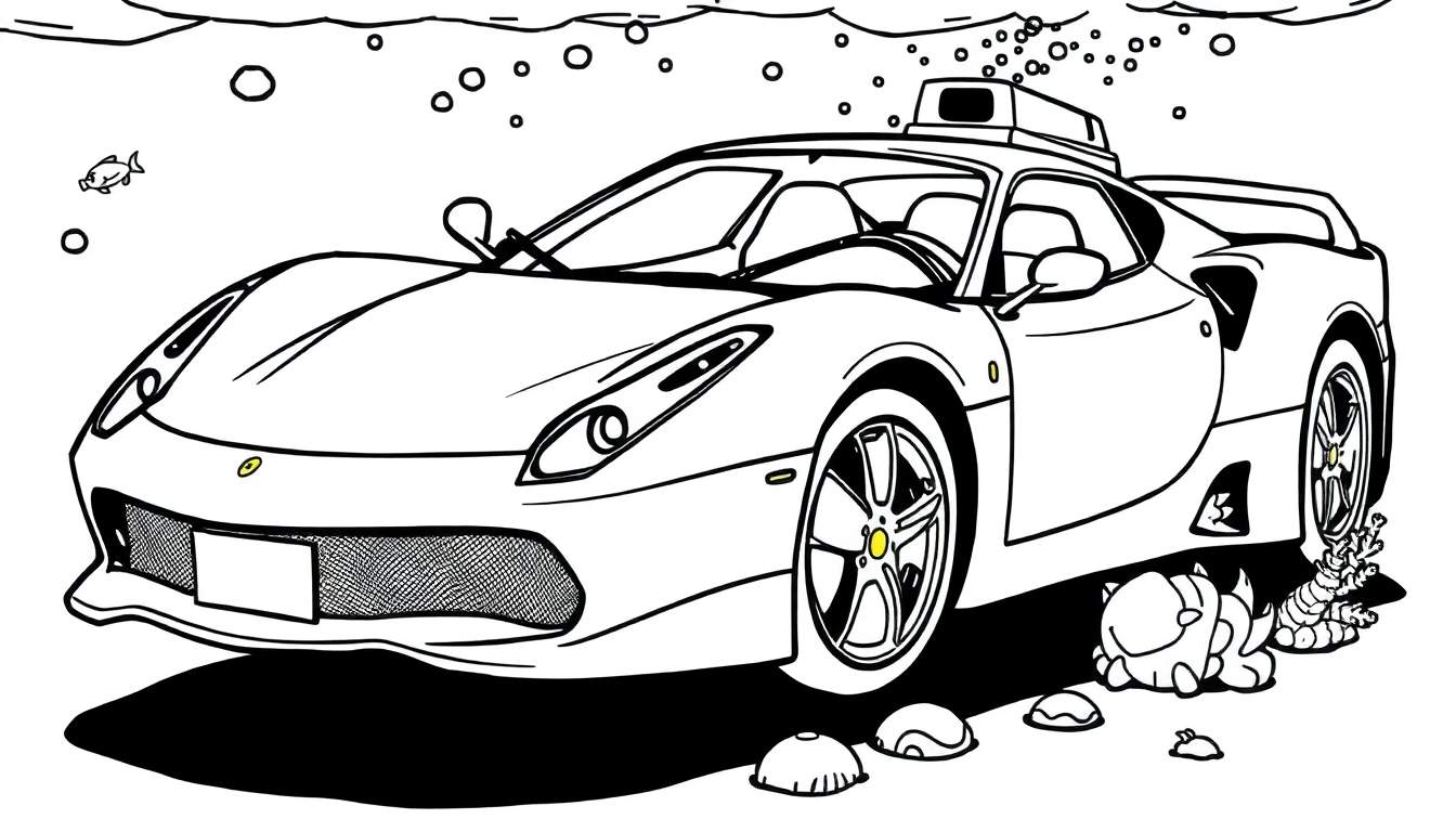 Deze gedetailleerde lijntekening toont een luxe sportauto, lijkend op een Ferrari, die vredig op de zeebodem rust. Omgeven door opstijgende luchtbellen, golvend wateroppervlak en kleurrijke zeeflora, nodigt deze kleurplaat uit tot een fantasierijk onderwater avontuur. De gele accenten op het logo en de velgen contrasteren met de zwart-wit tekening, terwijl een kleine vis nieuwsgierig voorbij zwemt. Perfect voor creatieve kunstenaars die van unieke en surrealistische thema’s houden.