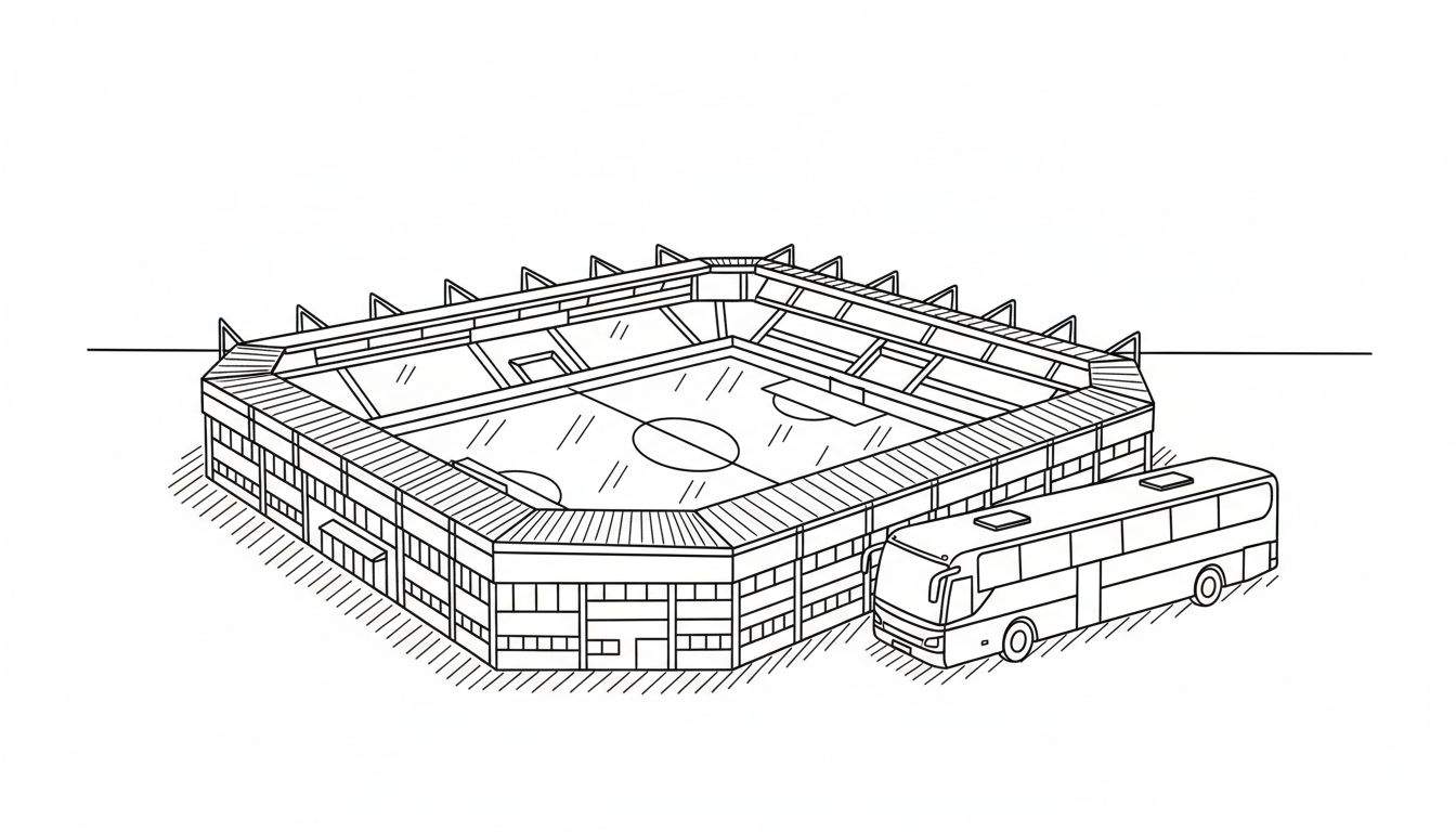 Een zwart-witte lijntekening kleurplaat van een imposant sportstadion met tribunes en een sportveld, geflankeerd door een passagiersbus. Ideaal voor urenlang kleurplezier en creatieve expressie.