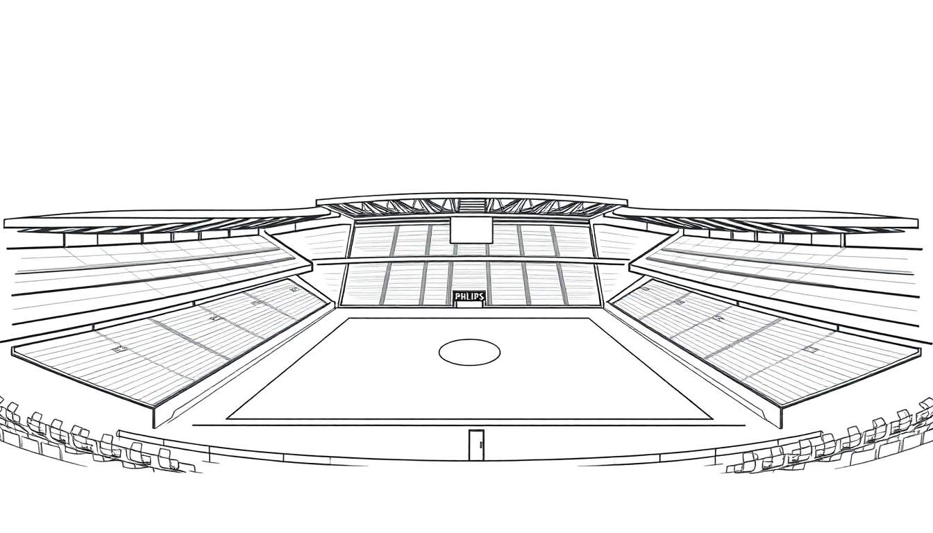 Wat deze tekening extra bijzonder maakt, is de aandacht voor detail op strategische plekken. Boven de tribunes prijkt een groot, leeg scorebord, klaar om gevuld te worden met de spanning van een wedstrijd. Aan de overkant, op veldniveau, spotten we een iconisch reclamebord met de naam ‘PHILIPS’, een subtiele knipoog naar de commerciële kant van sport. Onderaan de tekening is een kleine toegangspoort zichtbaar, wat de schaal van het stadion benadrukt. De stoelen op de voorgrond, die de kromming van de arena volgen, nodigen uit om de sfeer van een volle zaal te verbeelden, zelfs in deze lege, schematische weergave. Het is een perfecte basis voor iedereen die gefascineerd is door sportfaciliteiten, architectuur, of simpelweg op zoek is naar een creatieve uitdaging.