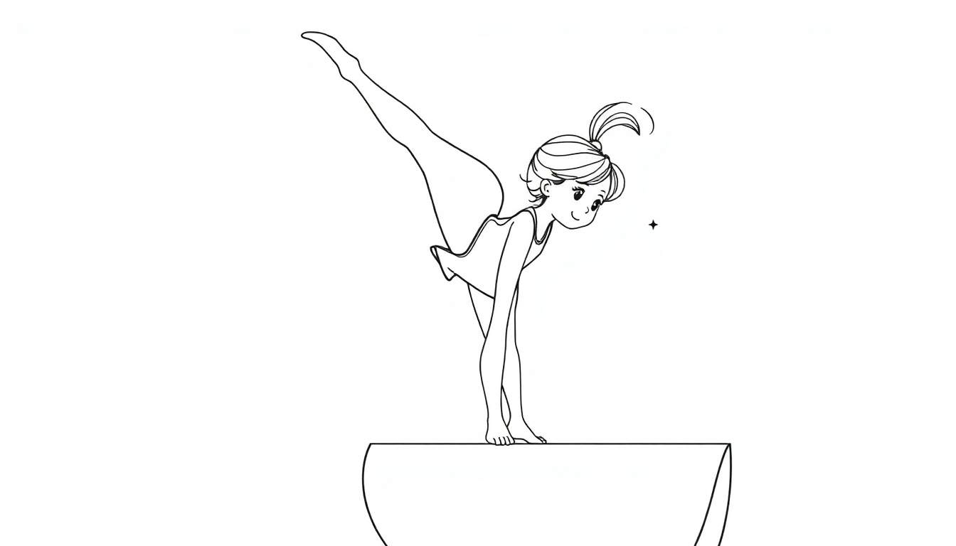 Deze betoverende kleurplaat toont een jonge turnster in volle actie op de evenwichtsbalk. Met haar rechtervoet stevig op de dikke balk geplaatst, strekt ze haar linkerbeen elegant naar achteren omhoog, terwijl haar bovenlichaam een sierlijke boog vormt. De licht gebogen armen vullen de compositie aan, en haar vriendelijke glimlach straalt zelfvertrouwen en plezier uit. Het kleine sterretje boven haar hoofd voegt een vleugje magie toe, misschien symboliserend de droom van perfectie of een moment van triomf.