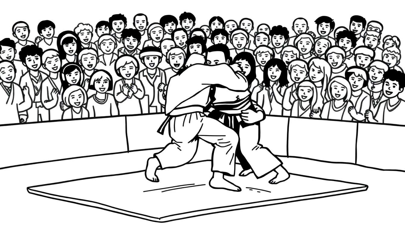 Een spannende kleurplaat van een vechtsportwedstrijd, vermoedelijk judo, met twee atleten in actie op de mat en een enthousiast publiek op de achtergrond. Perfect voor jonge sportfans om in te kleuren!