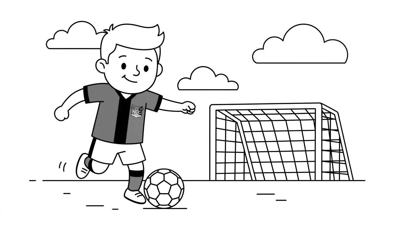 Een zwart-wit kleurplaat met een vrolijke jongen met blond haar die lacht en voetbalt. Hij draagt een tweekleurig voetbalshirt (grijs en wit) met het logo ‘NCC’ erop, een korte broek, sokken en sportschoenen. De jongen is in volle actie, zijn rechtervoet is dicht bij de bal en zijn linkerbeen beweegt, klaar om de voetbal te trappen of te dribbelen. Voor zijn voeten ligt een klassieke voetbal met zeshoeken en vijfhoeken. Rechts in het plaatje staat een voetbaldoel met net. Boven de scène zweven drie wolken en horizontale streepjes op de grond suggereren een voetbalveld of beweging. Een dynamische en vrolijke scène van een kind dat buiten geniet van voetbal, perfect voor jonge NEC-fans.