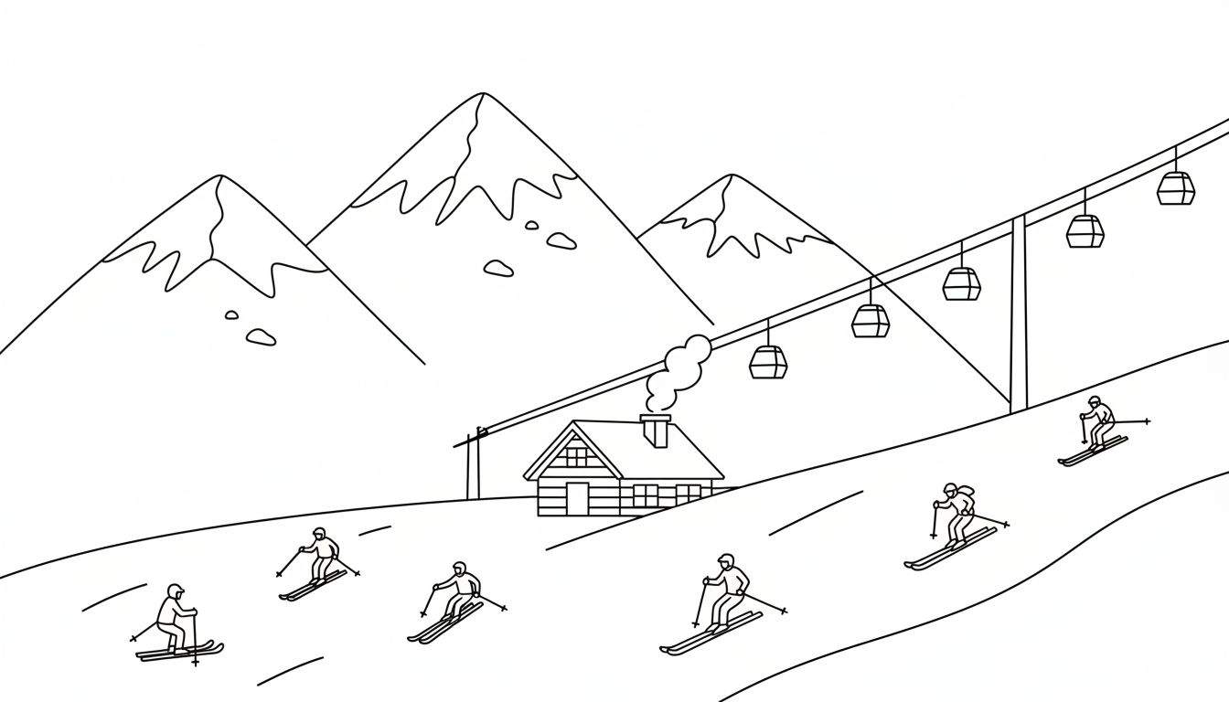 Een charmante zwart-wit kleurplaat die een idyllisch winters berglandschap weergeeft. De scene bevat majestueuze bergen met besneeuwde toppen, een knusse houten hut met rokerige schoorsteen, een functionerende skilift met gondels, en vrolijke skiërs die van de helling afglijden op een brede skipiste. Perfect voor creatieve winterse ontspanning.