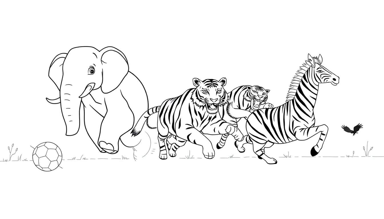 Leuke Kleurplaat: Olifant, Tijgers en Zebra Rennen met Voetbal!