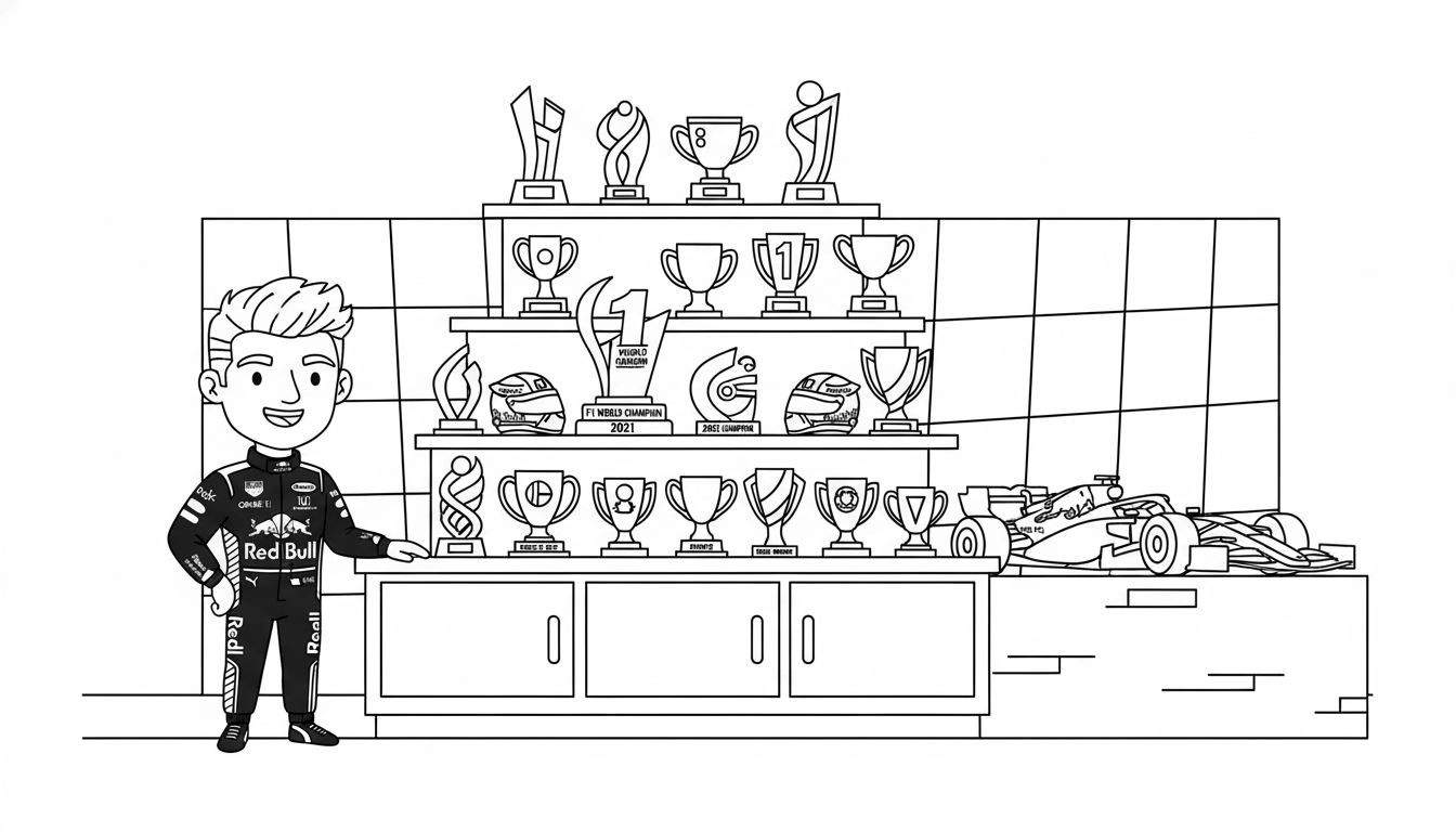 Max Verstappen Kleurplaat | F1 Wereldkampioen Met Red Bull Trofeeën & Raceauto