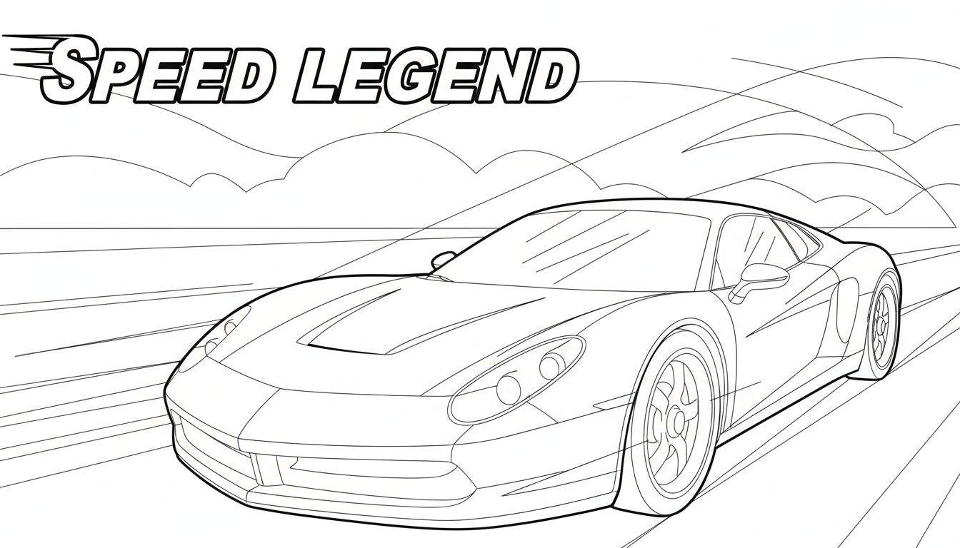 Een dynamische zwart-wit kleurplaat met een gestroomlijnde sportwagen in actie. De tekst ‘SPEED LEGEND’ en abstracte achtergrondlijnen creëren een sfeer van hoge snelheid en race-avontuur. Perfect voor autoliefhebbers en creatievelingen.