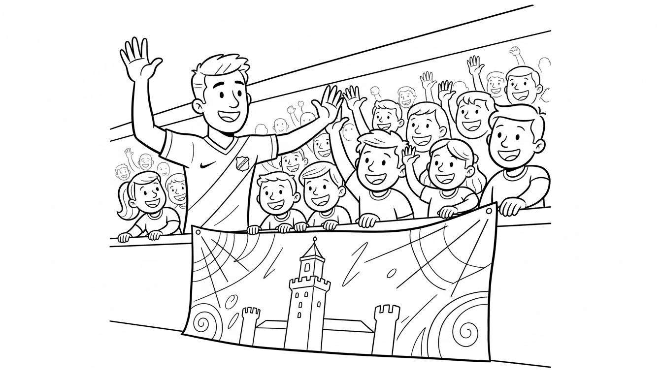 Deze dynamische zwart-wit lijntekening, die smeekt om ingekleurd te worden, toont een scene vol vreugde en gemeenschappelijke opwinding. Op de voorgrond staat een opvallende, vrolijke man, gekleed in een sportshirt met een duidelijke V-hals, een logo en een diagonale streep – kenmerkend voor de uitstraling van NAC Breda. Met een brede glimlach en een enthousiaste zwaaiende rechterhand zet hij de toon voor het feestelijke tafereel dat zich achter hem ontvouwt.