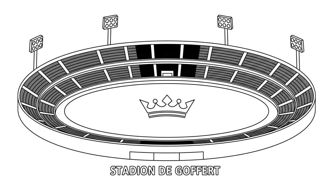 Centraal op het veld prijkt een mysterieuze, gestileerde kroon. Wat zou deze symboliseren? Is het een teken van koninklijke aspiraties, of misschien een knipoog naar een toekomstige kampioenstitel voor NEC? Het is een intrigerend detail dat de verbeelding prikkelt. Onderaan de kleurplaat staat duidelijk ‘STADION DE GOFFERT’, een herinnering aan de rijke geschiedenis en de thuisbasis die door generaties fans wordt gekoesterd. Pak je potloden en geef deze iconische plek de kleuren die het verdient!