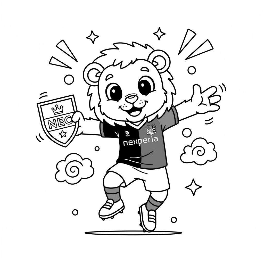 De leeuw draagt met trots een gedetailleerd voetbaltenue, bestaande uit een shirt met de herkenbare NEC-letters en het logo van sponsor Nexperia. Let op de gestreepte sokken en voetbalschoenen, en natuurlijk het schild in zijn hand, versierd met een kroon, de letters ‘NEC’ en een ster. Rondom hem zweven sterren, uitroeptekens en wolkjes, wat de feestelijke en energieke sfeer van een wedstrijd of overwinning perfect weergeeft. Pak je potloden en stiften en maak er een meesterwerk van!