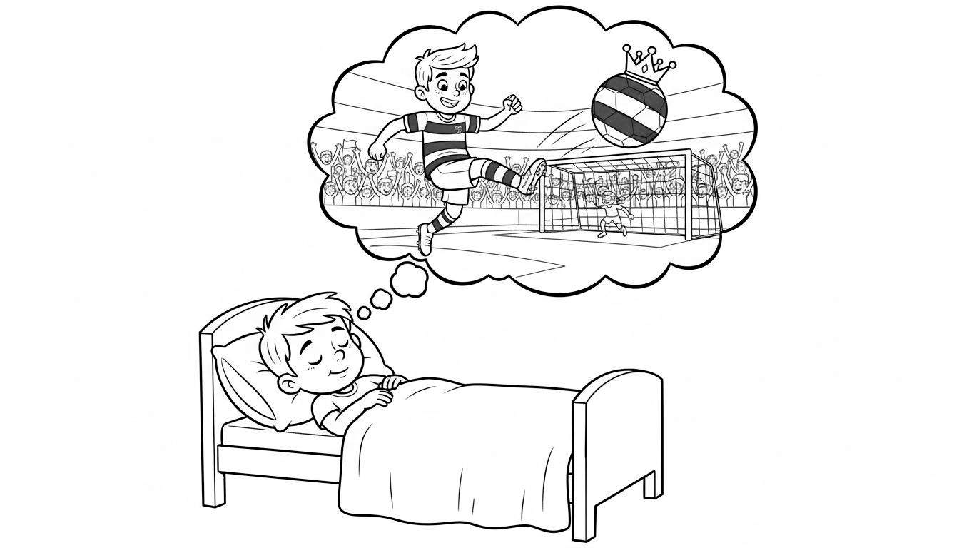 Duik in de magische wereld van dromen met deze unieke kleurplaat! Je ziet een jongen vredig slapen in zijn bed, dromend van zijn grootste voetbaltriomf. Boven zijn hoofd zweeft een droomwolk die zijn fantasie tot leven brengt: hij is een stoere voetballer in een gestreept shirt en korte broek, klaar om een krachtige trap te geven. De bal, versierd met een kroon, symboliseert een winnend moment. Een kleine keeper probeert tevergeefs de bal te stoppen, terwijl op de achtergrond een juichend stadionpubliek de sfeer compleet maakt. Een perfecte kleurplaat voor jonge voetbalfans en dromers, met een knipoog naar PEC Zwolle!