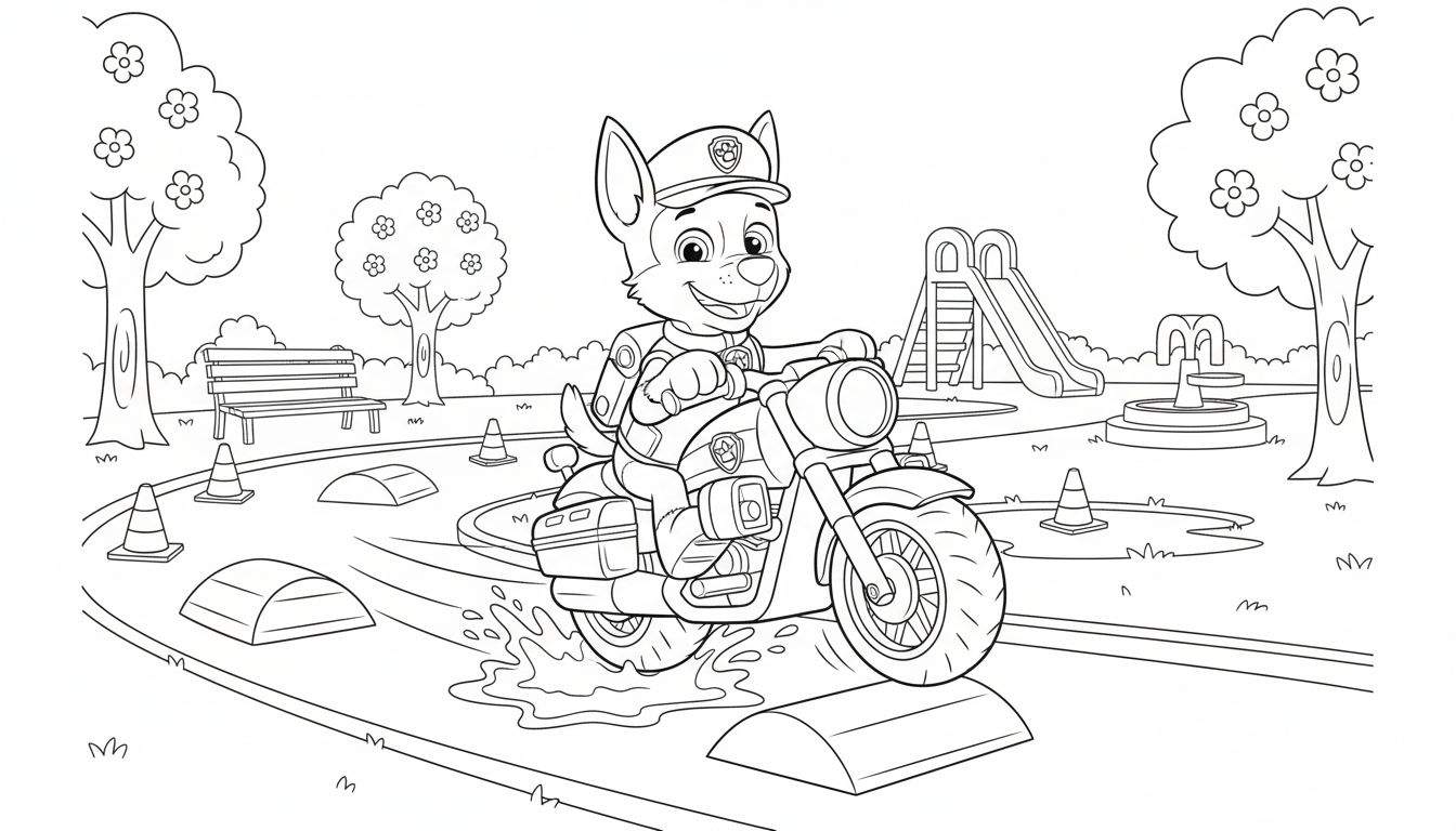 Ontdek deze gedetailleerde zwart-wit kleurplaat van Chase, de dappere politiehond van Paw Patrol. Hij rijdt vrolijk op zijn motorfiets door een uitdagend parcours vol plassen en verkeerskegels in een levendig park. Op de achtergrond zijn bomen met bloemen, een parkbankje, een glijbaan en een fontein te zien, allemaal klaar om met levendige kleuren tot leven te worden gebracht. Perfect voor jonge fans van Paw Patrol om hun creativiteit de vrije loop te laten.