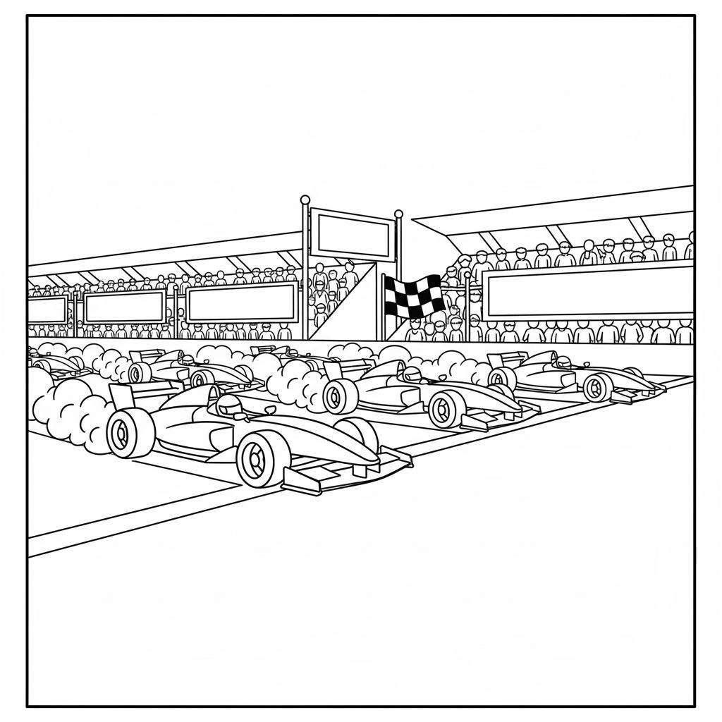 De tekening toont meerdere Formule 1-achtige wagens die over een breed circuit scheuren, met rookpluimen die hun razendsnelle start of inhaalacties suggereren. De tribunes staan vol met juichende toeschouwers, en op de achtergrond zie je grote scoreborden en een wapperende finishvlag, alles draagt bij aan de hectische en opwindende sfeer van een topklasse race-evenement. Deze kleurplaat is niet zomaar een plaatje; het is een uitnodiging om deel te nemen aan de race, gewapend met potloden en stiften.