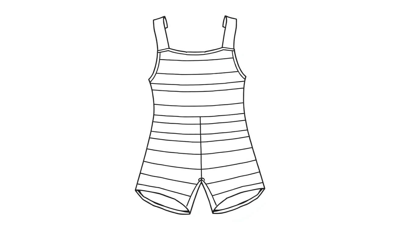 Deze intrigerende kleurplaat toont een fascinerend kledingstuk: een retro zwempak, waarschijnlijk uit de gloriedagen van vintage badmode. Met zijn smalle schouderbandjes, strakke rechte halslijn en mouwloze ontwerp ademt het een sfeer van nostalgie en elegantie. Het meest opvallende kenmerk is ongetwijfeld de allover horizontale strepen, die het silhouet een dynamische uitstraling geven. De onderkant is uitgewerkt met korte pijpjes, vergelijkbaar met een schattig shortje, wat een speels en praktisch tintje toevoegt. Een subtiele verticale naad in het midden van de pijpjes, eindigend in een kleine split tussen de benen, accentueert het ontwerp en zorgt voor extra bewegingsvrijheid.