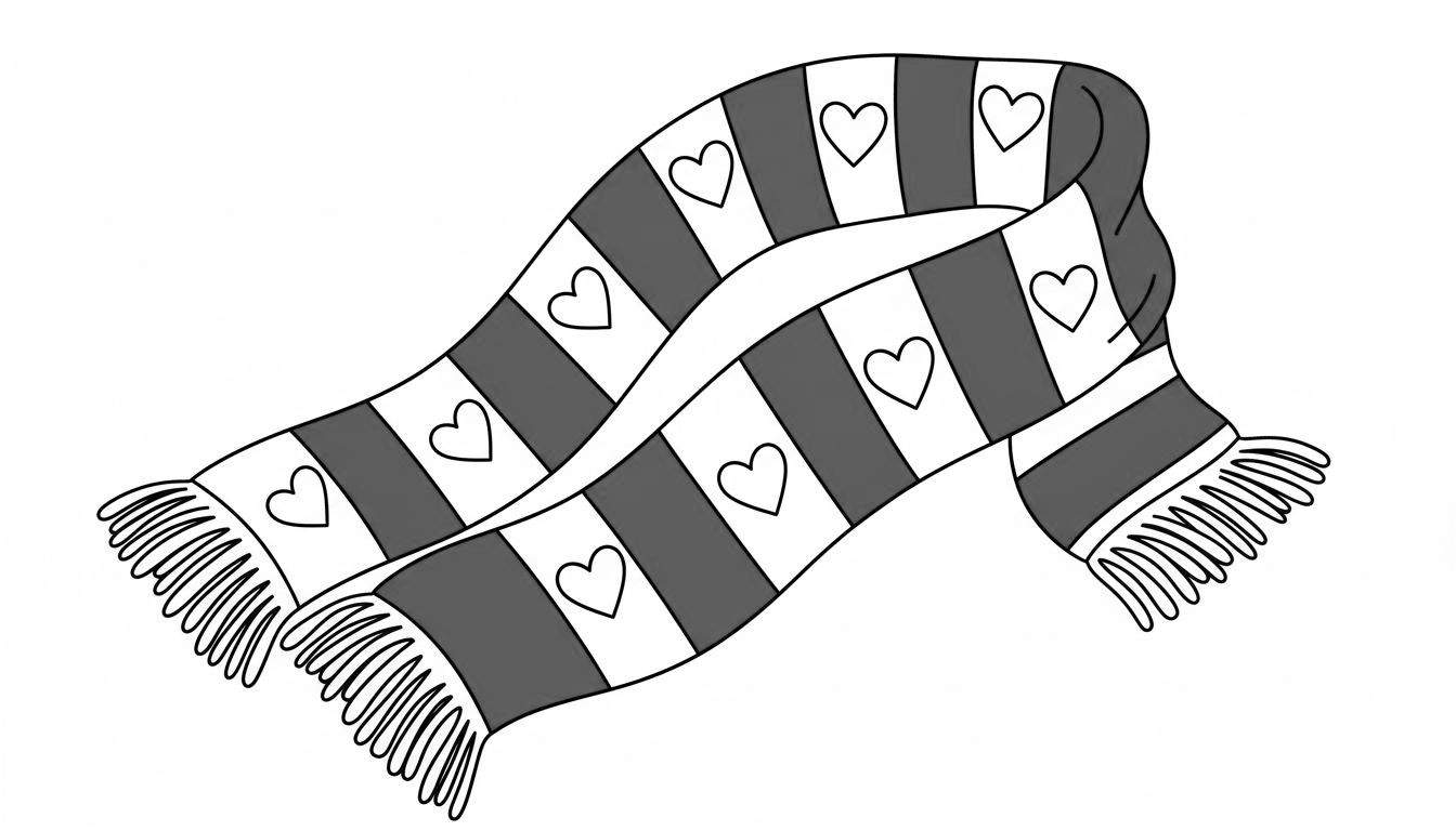 Een dynamische zwart-wit kleurplaat van een golvende sjaal, gewijd aan SC Heerenveen. De sjaal is voorzien van een gestreept patroon met afwisselend donkergrijze (bedoeld voor de clubkleuren) en witte banen, waarbij op elke witte baan een charmant hartje is getekend. Aan beide uiteinden van de sjaal zijn sierlijke franjes te zien, wat de indruk van beweging versterkt. Deze kleurplaat nodigt fans uit om de sjaal in de kenmerkende clubkleuren tot leven te brengen.