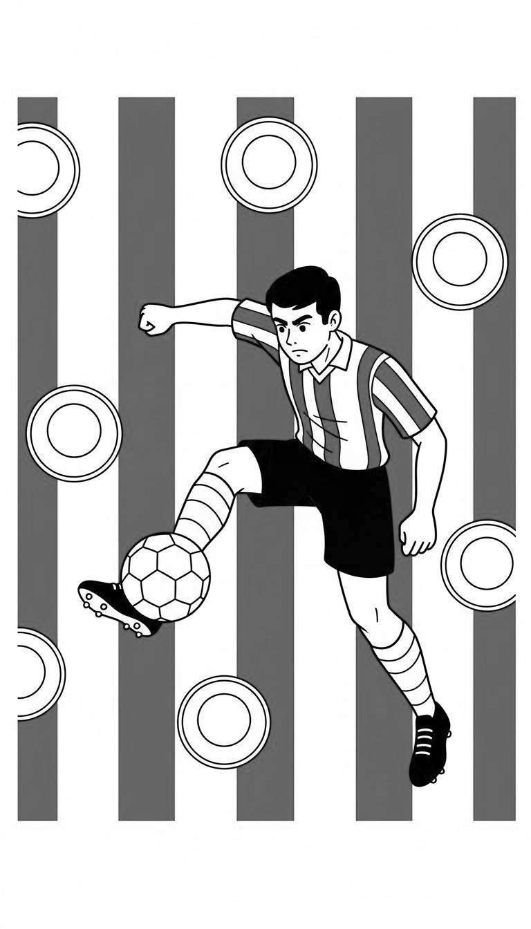 De achtergrond draagt bij aan de dynamiek met zijn verticale banen in wit en donkergrijs/zwart, afgewisseld met speelse witte cirkels die de snelheid en beweging van het voetbal symboliseren. Deze kleurplaat biedt niet alleen urenlang kleurplezier, maar stimuleert ook de creativiteit en fijne motoriek. Of je nu een jonge fan bent of gewoon houdt van de energie van sport, deze Sparta voetballer staat klaar om met jouw kleuren tot leven te komen!